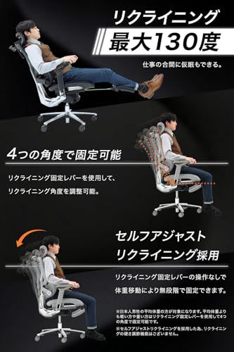 【多機能な上に快適】?リクライニング最大130度。4つの角度で固定可能。?収納式フットレストを搭載。仕事の合間、休憩時に快適に仮眠いただけます。?夏場も蒸れにくい背面メッシュ構造。