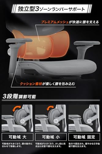 【 人間工学 に基づいた背面設計】腰を包み込む形状が特徴の3ゾーンランバーサポートが腰を快適に支えます。3ゾーンランバーサポートは?可動域:大、?可動域:小、?可動域:固定と3段階調節可能になっております。また背面5段階高さ調節が出来ることにより、お好みの位置で快適に腰を支えます。