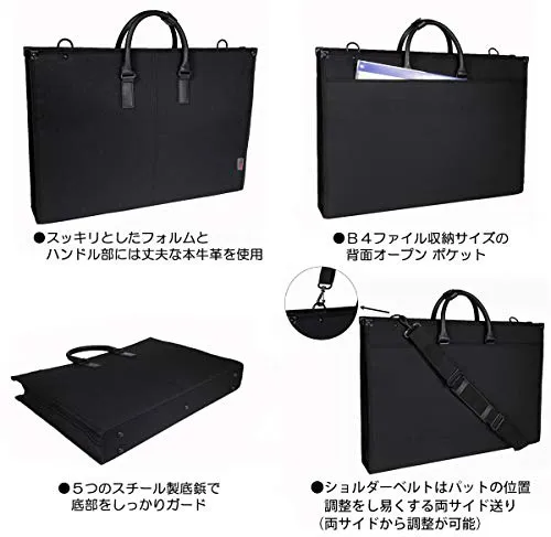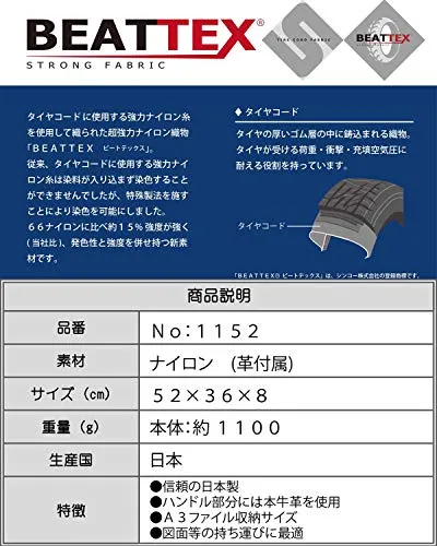 ■日本製で軽量の上、負担の掛かる取っ手には『本牛革』を使用し贅沢を極めた逸品です。 A3ファイルが入るので図面の持ち運びにも最適♪ サイズ:W52XH36XD8 cm 本体重量:1100g 素材:BEATTEXナイロン +革付属 付属品:ショルダーベルト JAN:4538695022114 生産国:日本