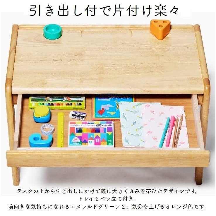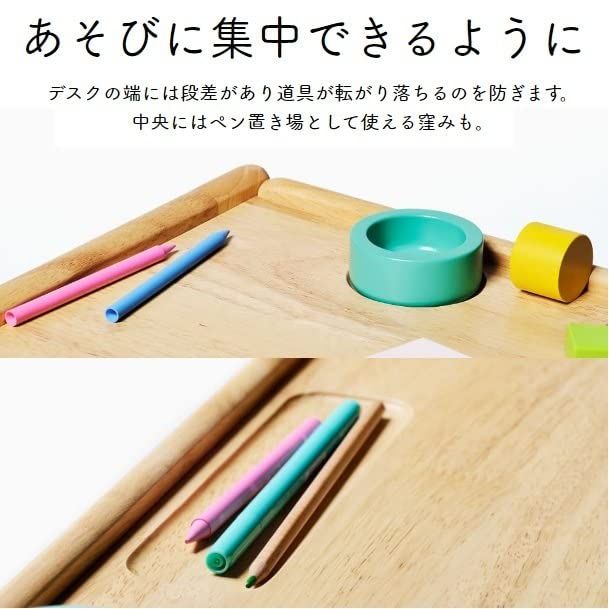 デスクはA3サイズが入る大きな引き出し付きで、スケッチブックやクレヨンなどを収納することができます。 デスクの端には段差があり道具が転がり落ちることを防いでくれます。 小物入れとペン立て付きです。