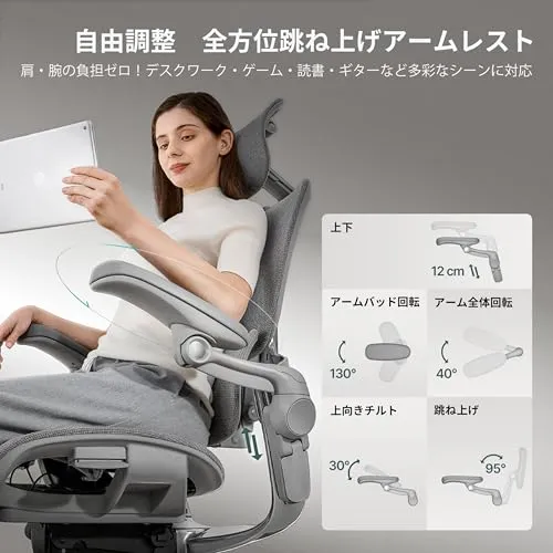「フルレンジ・アームレスト」:130のパッド回転、40の水平チルト、30の垂直チルトにより、さまざまな動作に適応します。読書やスマホプレイ時でも、肘や肩に確かなサポートを提供します。
