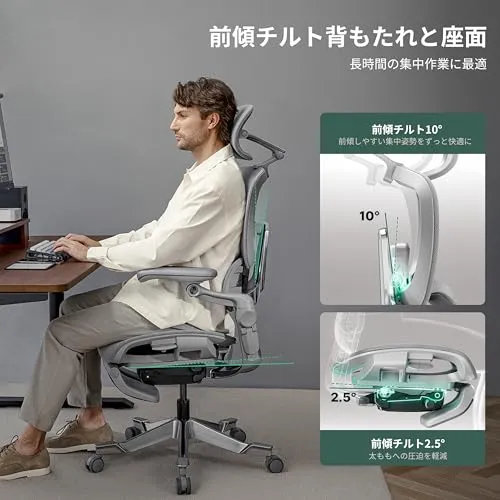 「2-in-1 ダイナミック背もたれ」:背もたれは10の前傾チルトと143のリクライニングが調整可能です。デスクワーク時の前傾姿勢でも、リラックス際の後傾姿勢でも、背中にダイナミックなサポートを提供します。