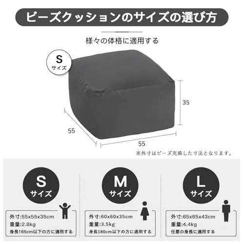 Homwarm ビーズクッション 怠惰なソファ 特大(55×55×35cm) 疲労解消 健康 安全 無味 カバー取り外し 洗濯可能 座り オールシーズン適用 0.3mm-0.5mm極小ビーズ 豆袋座布団 (グレー, S)/