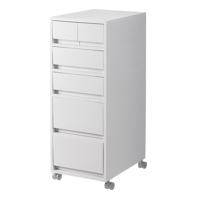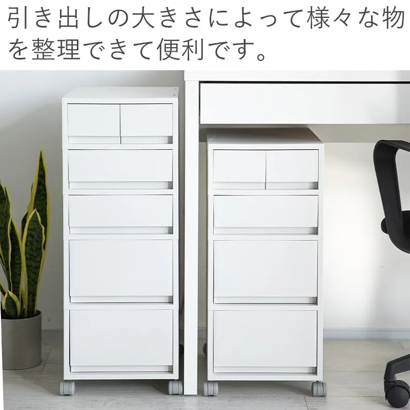 4段と5段のキャビネット。書類や化粧品、文房具など様々なものを収納できます。引き出しタイプで物を取り出しやすいです。