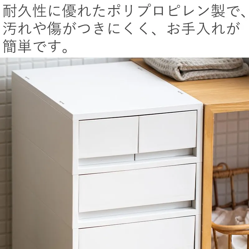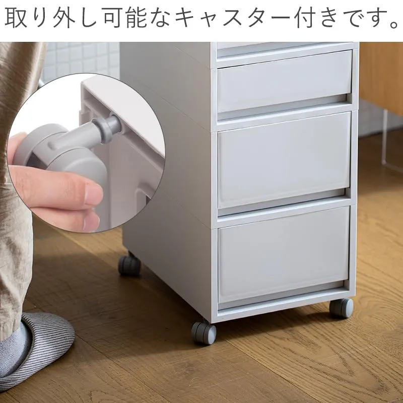 シンプルでインテリアになじむので、ベッド横、机、キッチン周りなど置き場所を選ばず使えます。一体型なので、重ねて置くタイプの引き出しのようにずれる心配がなく、より安定して設置できます。