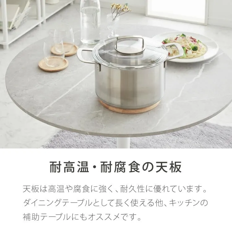 【MATERIAL 安心して使える素材】{耐高温・耐腐食の天板}天板は高温や腐食に強く、耐久性に優れています。ダイニングテーブルとして長く使える他、キッチンの補助テーブルにもオススメです。 お手入れも簡単:天板は耐水性に優れており、飲みこぼしなどもサッと拭き取って簡単にお手入れできます。 優しい面取り加工:天板のふちには角が出ないよう面取り加工を施しました。なめらかで優しい手触りです。 {お子様も安心の低ホルム}ホルムアルデヒドの放散を限りなく抑えました。小さなお子様のいるご家庭でも安心して使用することができます。