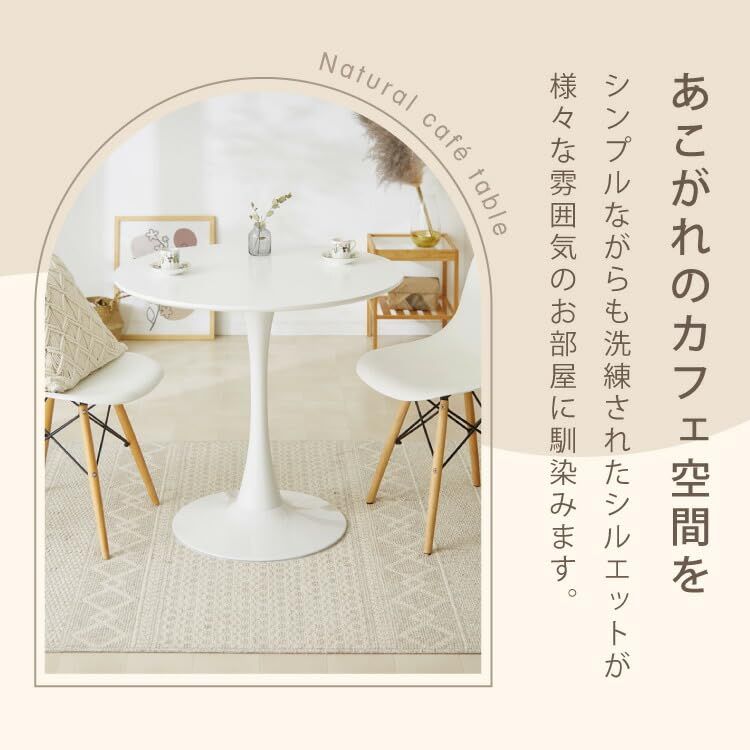 【COMFORT 快適な使い心地】{ちょうど良いサイズ感}1人2人掛けにぴったりな、場所を取りすぎないサイズ感です。スッキリとしたフォルムで圧迫感が無く、ワンルームにもおすすめです。 {省スペースな円形天板}四角形のテーブルに比べて円形デザインのテーブルは角が無いので、省スペースに配置ができお部屋を広く見せてくれます。 {脚元も広く快適に}脚部は一本足デザインで十分なゆとりがあり、脚を伸ばしたりと快適に座れる設計です。 滑り止め付き:脚裏には滑り止め用のパーツ付き。移動時のノイズを軽減し、傷から守る効果もあります。