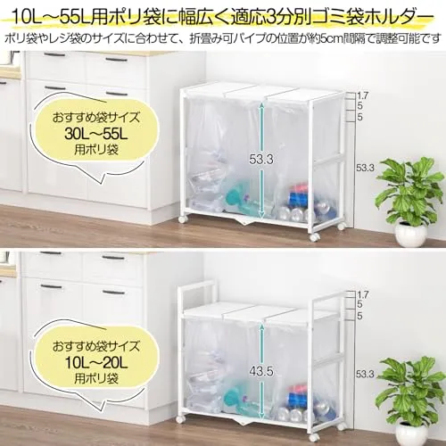 【20L55L袋対応】ポリ袋やレジ袋のサイズに合わせて、折畳み可パイプの位置が約5cm間隔で調整可能のダストボックスです。折畳み可パイプの高さの調整だけで10L、20L、30L、45L、55L袋に幅広く対応しております。容量が決められた普通のキッチン ゴミ箱と違って、ゴミ袋の大きさに合わせてゴミをよりいっぱい入れることができており、合計最大165Lの大容量でゴミ捨ての日までに何度も袋を替える必要がない上、一人暮らし 便利グッズとしてはもちろん、家庭用分別ゴミ箱として最適です。