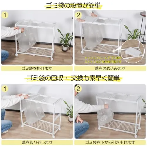 【ゴミ袋の設置などが簡単】ゴミ袋を上部フレームに引っかけて簡単にゴミ袋 スタンドとして使用できる上、蓋を取り外して、ゴミ袋の回収・交換も容易にできます。また、底部はメッンュフレームで、替えのゴミ袋を保管することで、袋交換がよりスム一ズに行えて便利です。