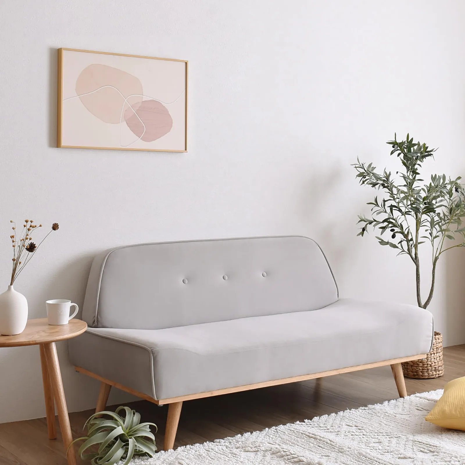 【丸いフォルムが特徴のシンプル&ミニマルなデザイン】柔らかな曲線が特徴的なフォルムで、ふんわりと柔らかい本体に木製脚の組み合わせがアクセントとなりお部屋をより一層おしゃれに引き立てます。