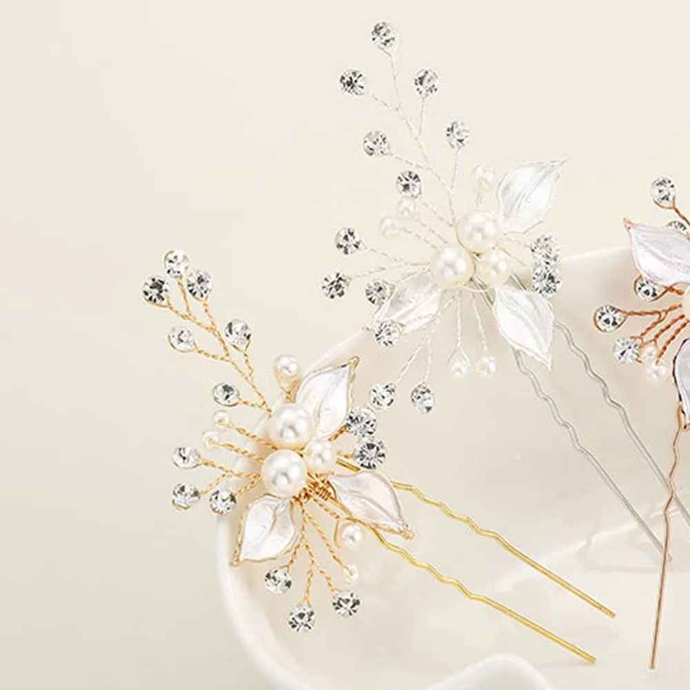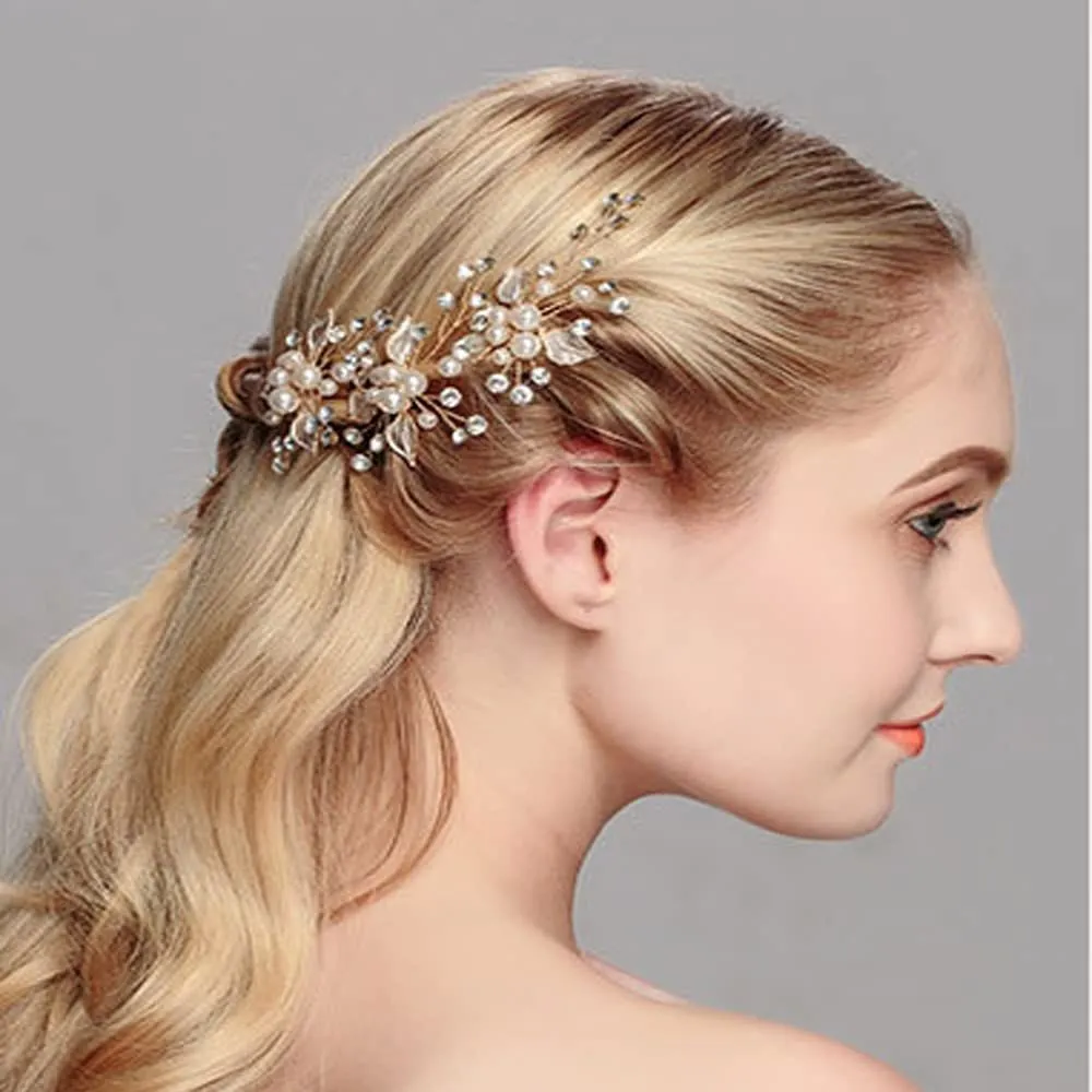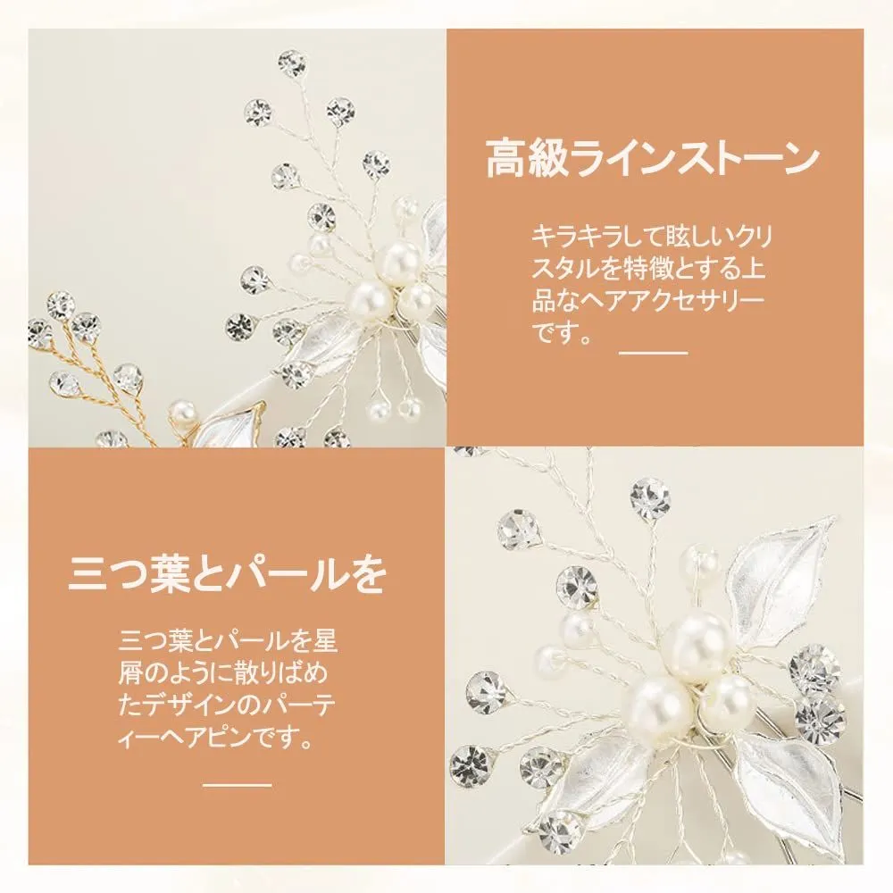 特徴:キラキラして眩しいクリスタルを特徴とする上品なヘアアクセサリーです。三つ葉とパールを星屑のように散りばめたデザインのパーティーヘアピンです。