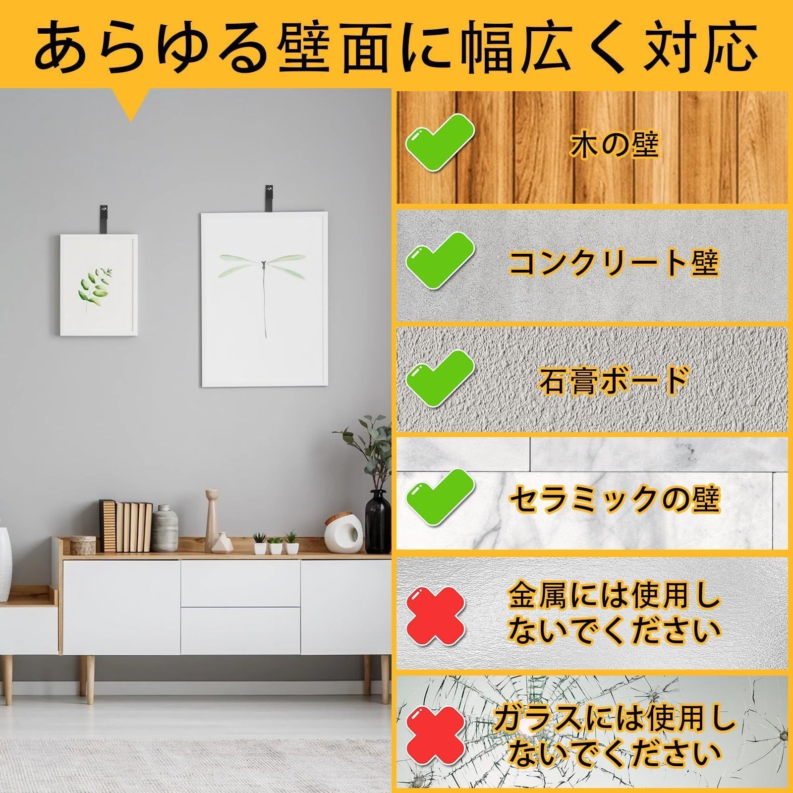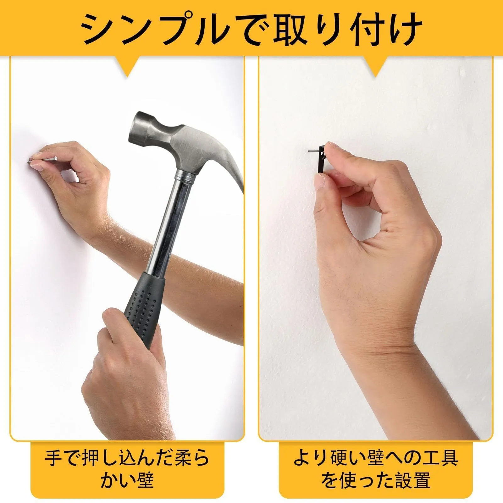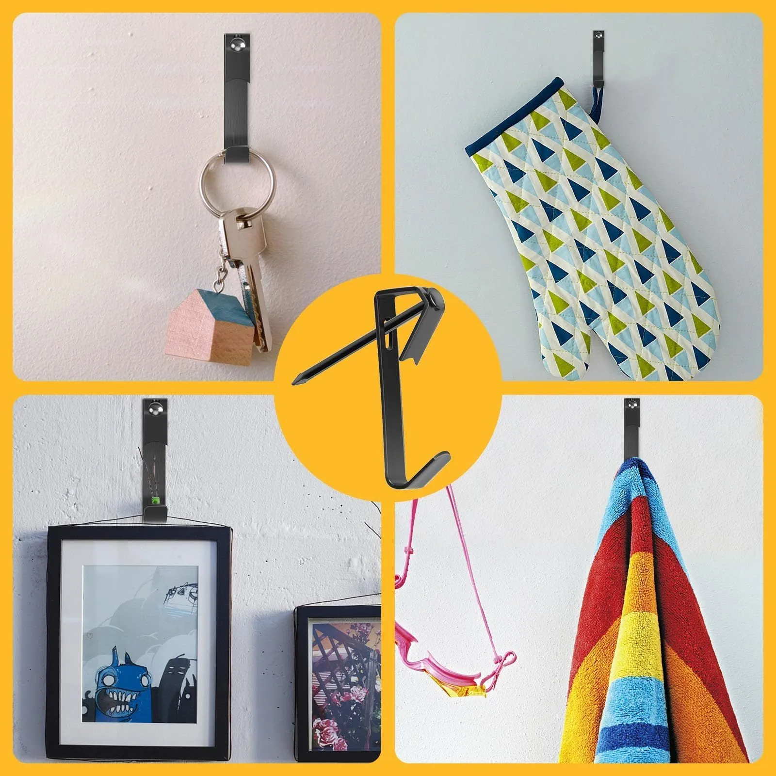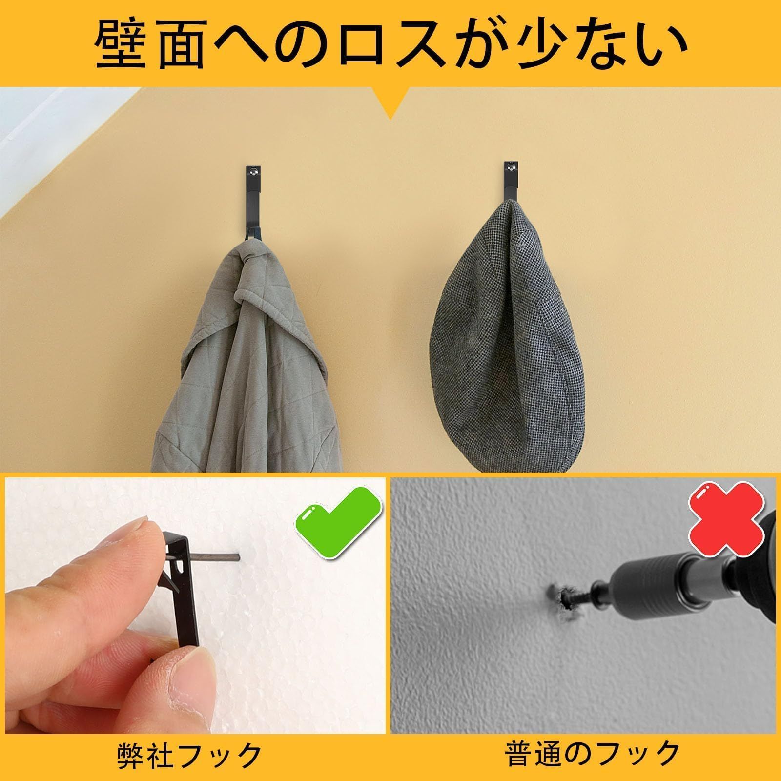 傷つけない: 従来の接着剤やマグネットフックではなく、傾斜した壁掛けフックの別れるデザインを採用しています。石膏ボード フックの針は非常に細く、壁にしっかり固定され、簡単には外れません。使用後、簡単に取り外し、小さな針穴だけが残り、壁に多くの損傷を与えることなく簡単に修復できます
