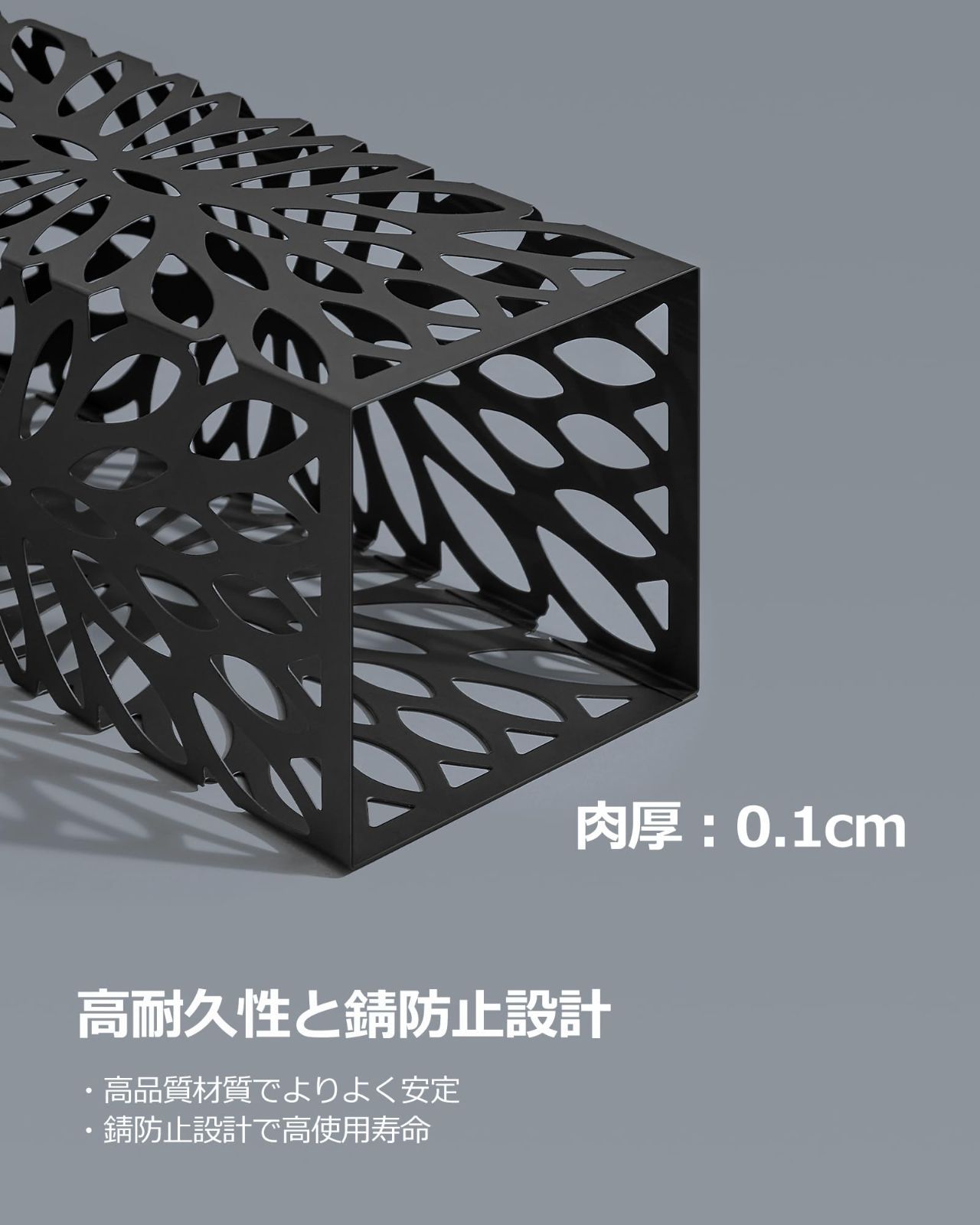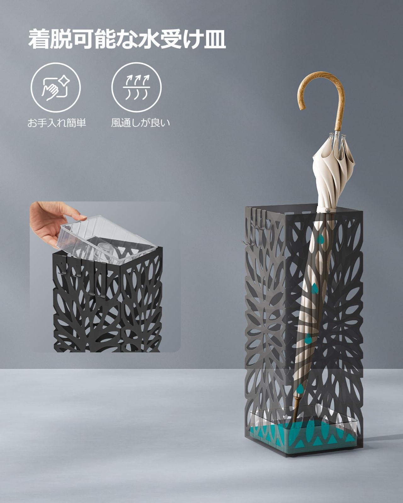 【風通しが良く倒れにくい】隙間の空いたデザインは風邪を通しやすく、濡れた傘を入れても乾きやすい。適当に重く十分な高さもあるもので、大型の傘も難なく収納できます。