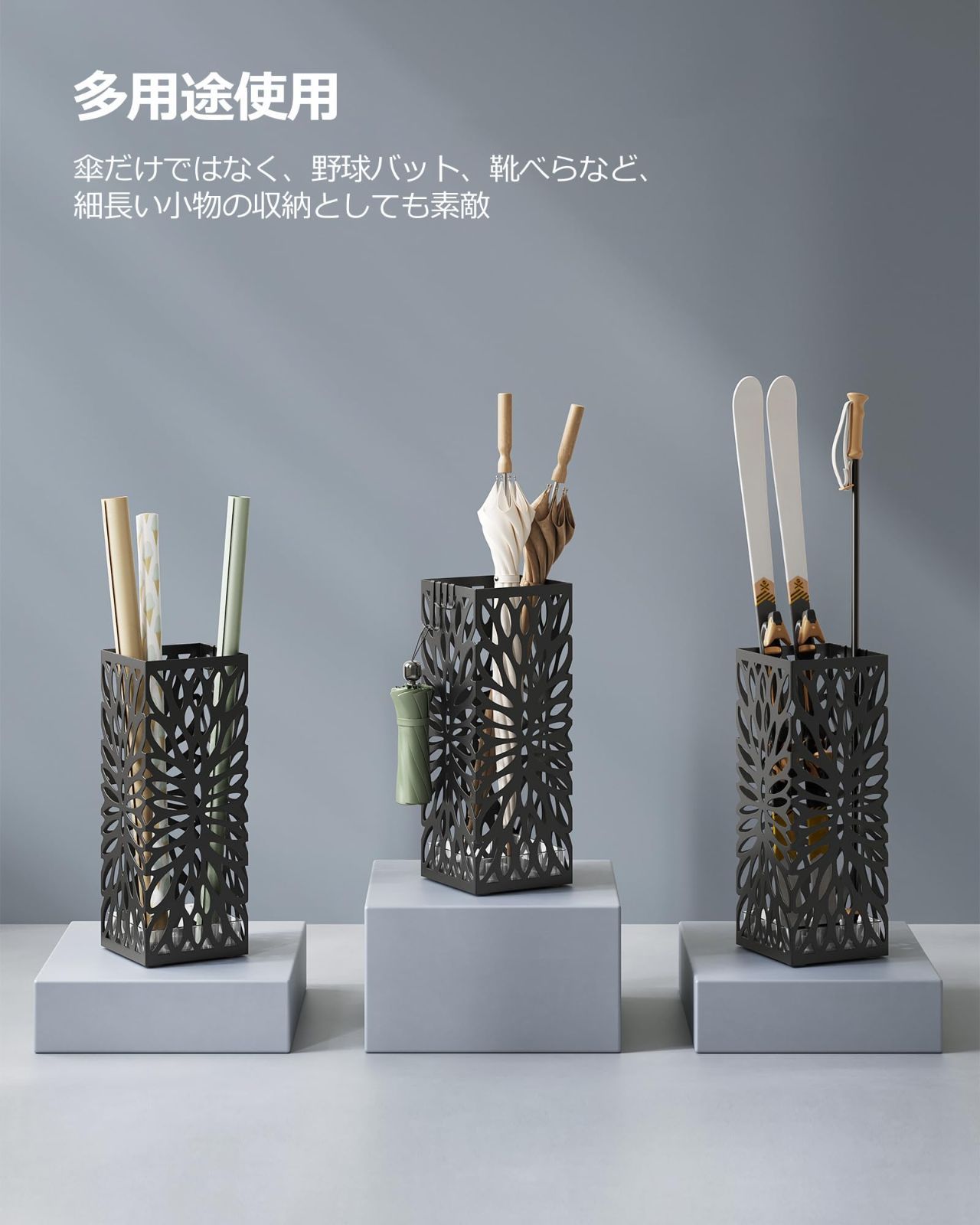 【色々な場所で活躍】傘だけではなく、野球バット、トレッキングポール、靴べら、自転車の空気入れなど、細長い小物の収納としても素敵です。自宅用だけではなく、事務所、レストラン、学校など、業務用にも是非お試し下さい