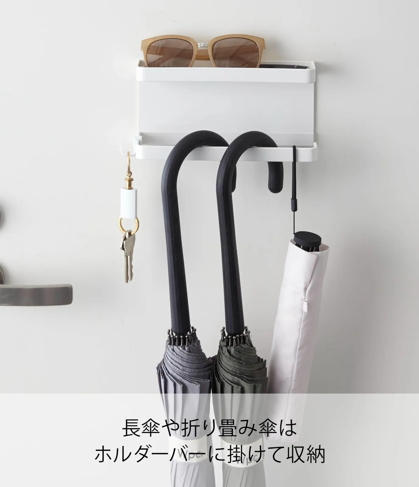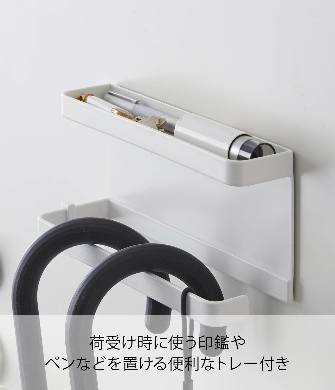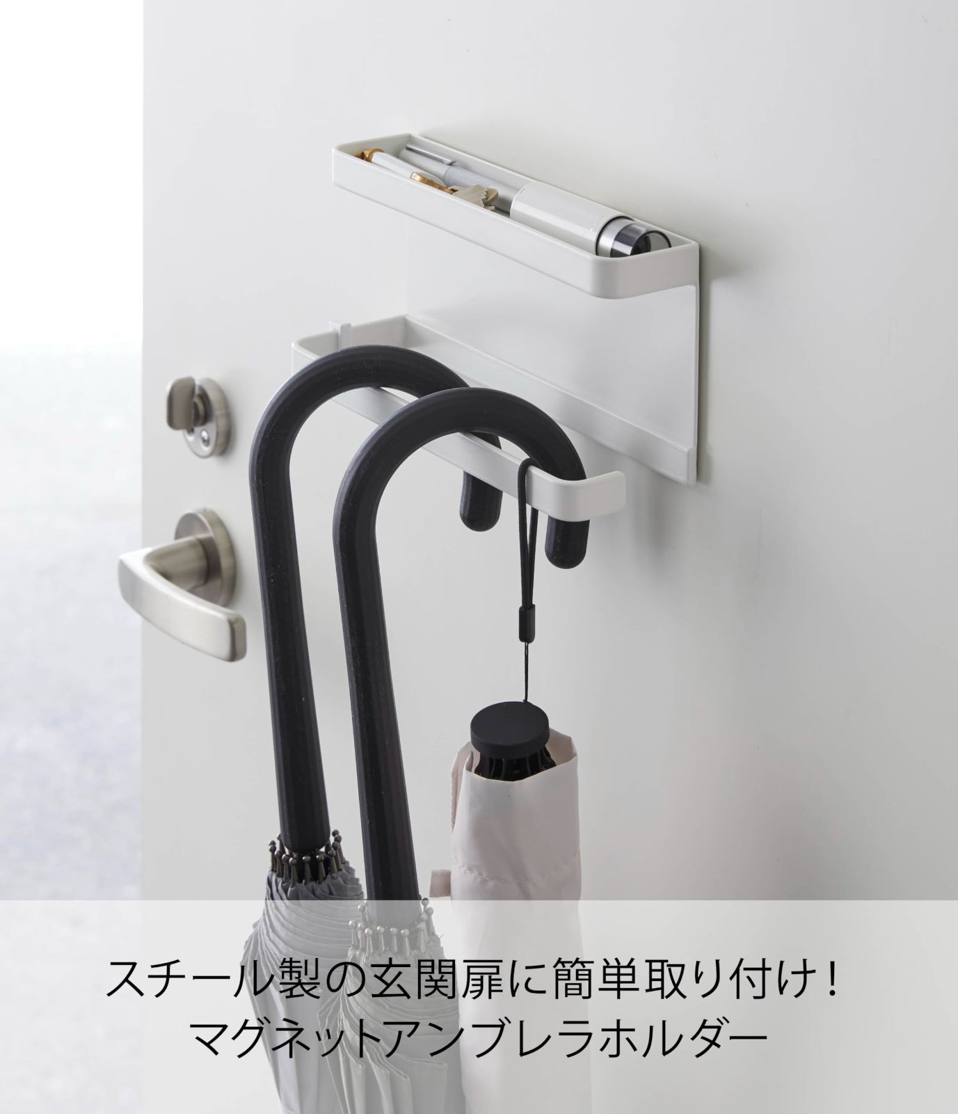 約W20XD7XH9.5cm スマート ホワイト 傘立て アンブレラホルダー 玄関扉収納 トレー付きマグネット フック付き 山崎実業(Yamazaki) 5041