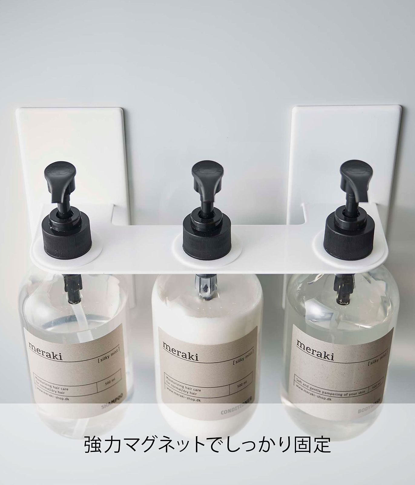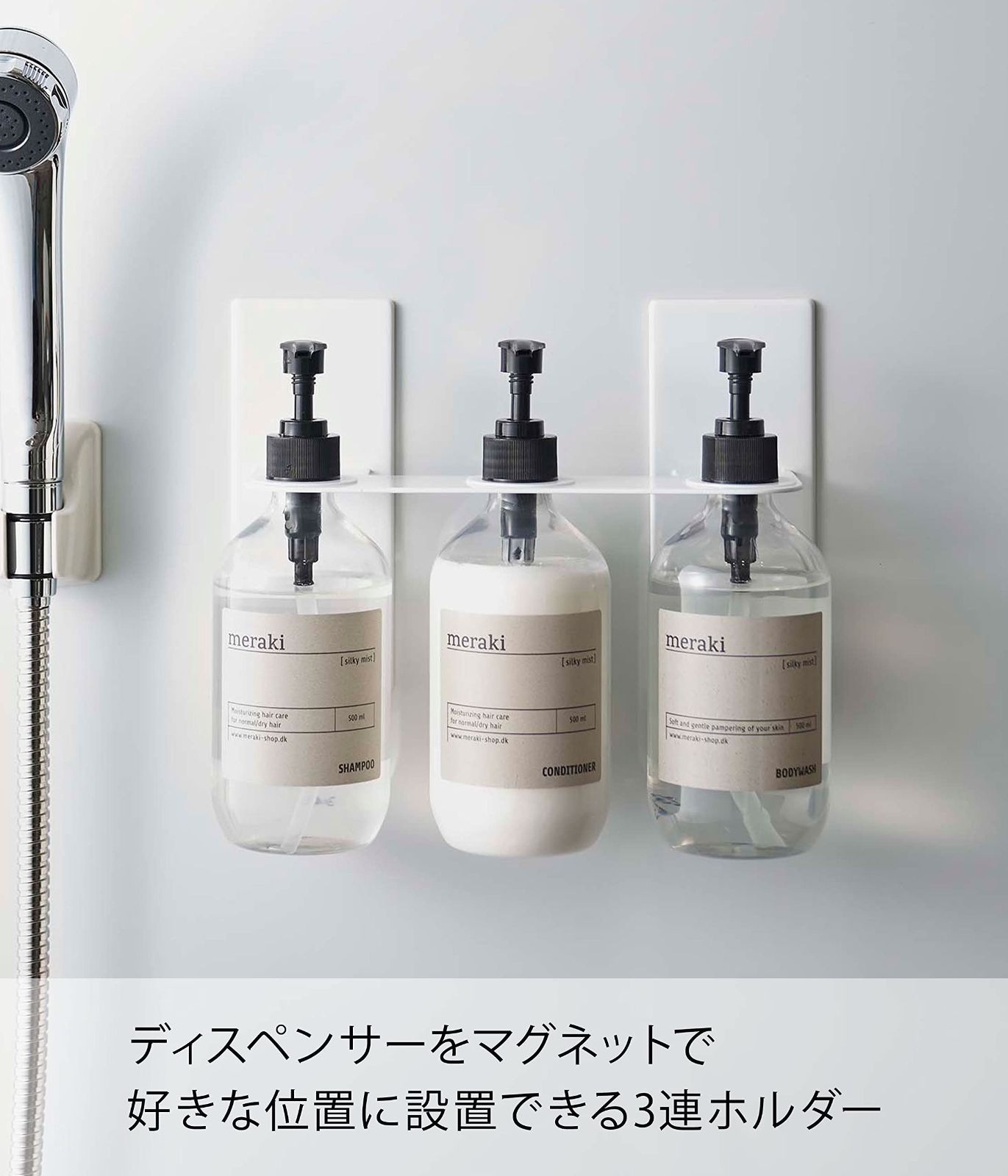 ディスペンサーをマグネットで好きな位置に設置できる3連ホルダー。