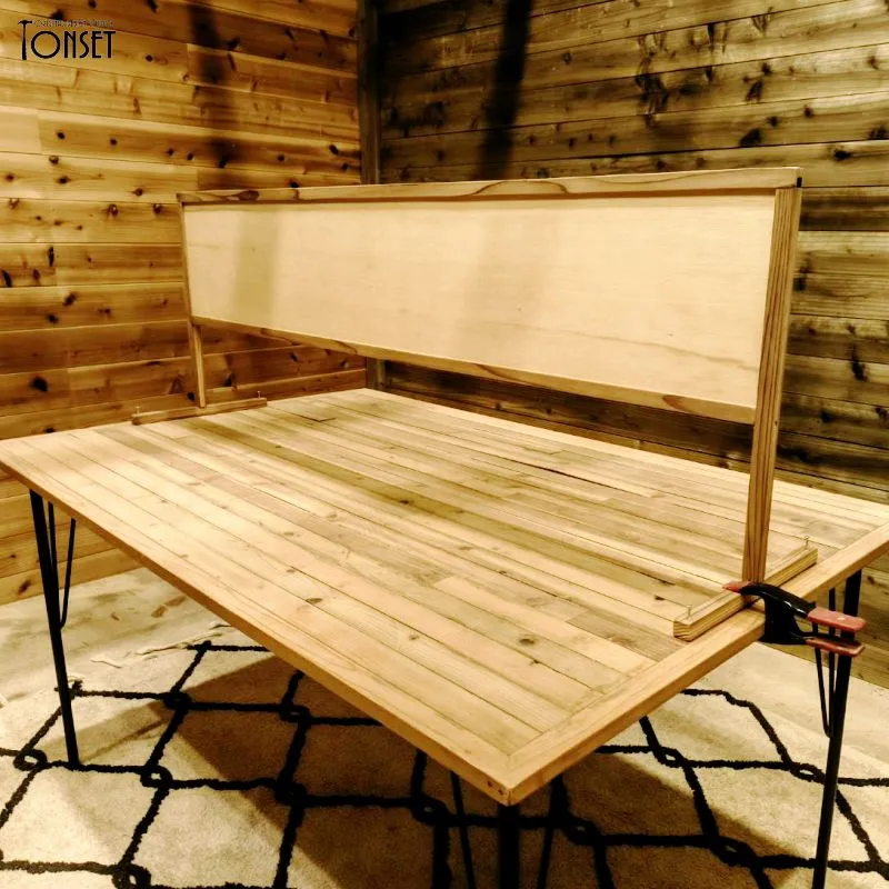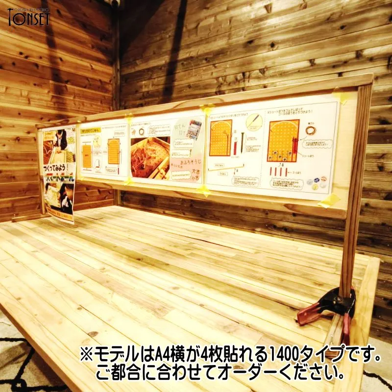 【受注生産商品】:製作納期 約3〜4日 ワークショップなどで組立説明図などを掲示するための掲示板スタンドです。 掲示パネル部はA4サイズが横で3枚貼り付けられるサイズ感となっております。 パネル部は当然ながら木ですのでマスキングテープでもプッシュピンでも使えるので便利です。 マルシェ出店などでワークショップをされる方の多くは1200サイズのテーブルを使用される方が多いことを鑑みてのサイズ感となっておりますが、都合に応じてサイズを延ばしたり縮めたりも可能ですので別途オーダーでご相談ください。 シンプルなT型の足で、机とクランプで挟んで仮固定することもできますし、画像のように足に穴をあけてテーブルとビスで固定することも可能です。(穴およびビスは別途です。) 両面使うこともできるので対面での簡易的な目隠しにもなります。パネル下は200mmの空間を開けてますので、ここに対面で共用の道具を置いたりすることも可能になっております。 その他シンプルなデザインのパネルですので、掲示板ではなく商品陳列用の什器としても活躍してくれると思います。 ※こちらの商品は発送サイズの都合上、足の棒は外した状態でビスと共に同梱させていただきますので、商品が到着しましたらお客様ご自身で付属のビスを使って足を取り付ける作業をお願いしております。 ★製品概要★ ・サイズ:(本体)約幅1040mm×奥行300mm×高さ490mm ・使用木材:スギ、合板 ・使用塗料:水性ステイン塗料 ★使用上のご注意★ ・こちらは自然素材を使用した製品となりますので、経年劣化で現状より木部同士の隙間が大きくなる可能性もあります。 ・商品によって多少のサイズ誤差、木部同士の隙間の大小、塗装ムラなどがございますが、手作り品の味や雑貨特有のラフさの演出としてご理解ください。 ・棚部分にはあまり重たいものを載せないでください。安定感が損なわれたり、棚が破損する可能性が高くなります。 ・特に防水性のある塗料を塗布してませんので、屋外での使用は雨濡れにはご注意ください。 価格を抑えるために下記の部分を省略製作していますのでご確認ください。