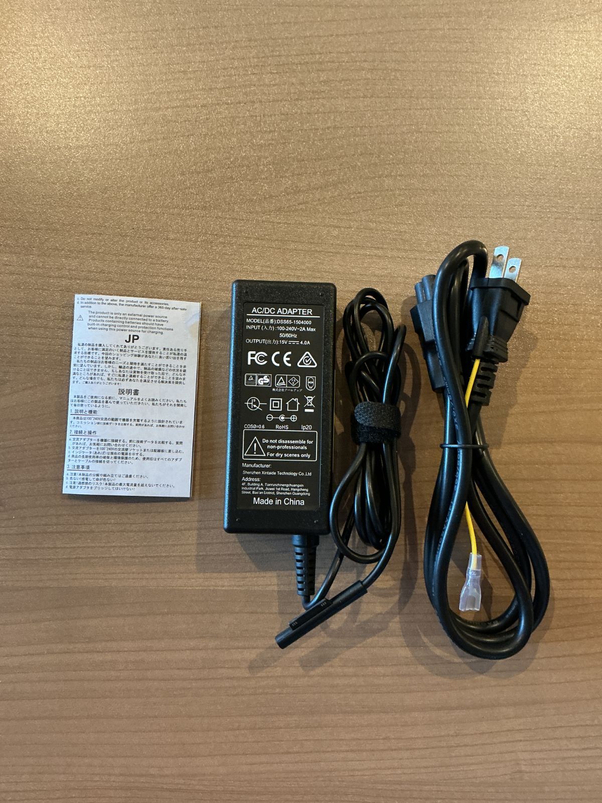商品仕様:入力 100-240V 50/60 Hz、出力:15V 4A( 65W 15V 4A、 44W 15V 2.58A、36W 12V 2.58A、24W 15V/1.6Aにも対応可能)。AC電源コードの長さ:1.2m、DCケーブルの長さ:1.5m