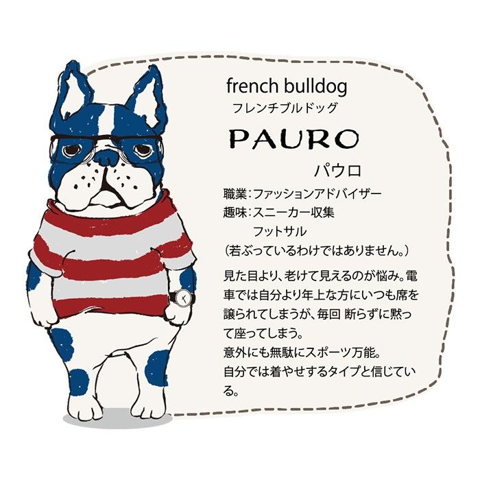 ■フレンチブルドッグ パウロ 職業:ファッションアドバイザー 趣味:スニーカー収集、フットサル(若ぶっているわけではありません。) 見た目より、老けて見えるのが悩み。電車では自分より年上な方にいつも席を譲られてしまうが、毎回断らずに黙って座ってしまう。 意外にも無駄にスポーツ万能。 自分では着やせするタイプだと信じている。