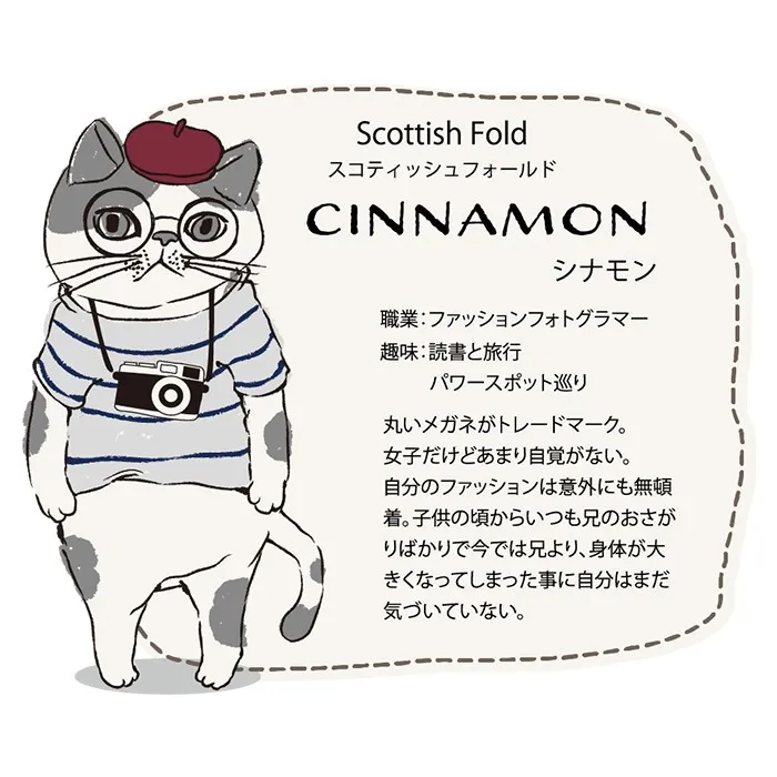 ■スコティッシュフォールド シナモン 職業:ファッションフォトグラマー 趣味:読書と旅行、パワースポット巡り 丸いメガネがトレードマーク。女子だけどあまり自覚がない。 自分のファッションは意外にも無頓着。 子供の頃からいつも兄のおさがりばかりで今では兄より、身体が大きくなってしまった事に自分はまだ気づいていない。