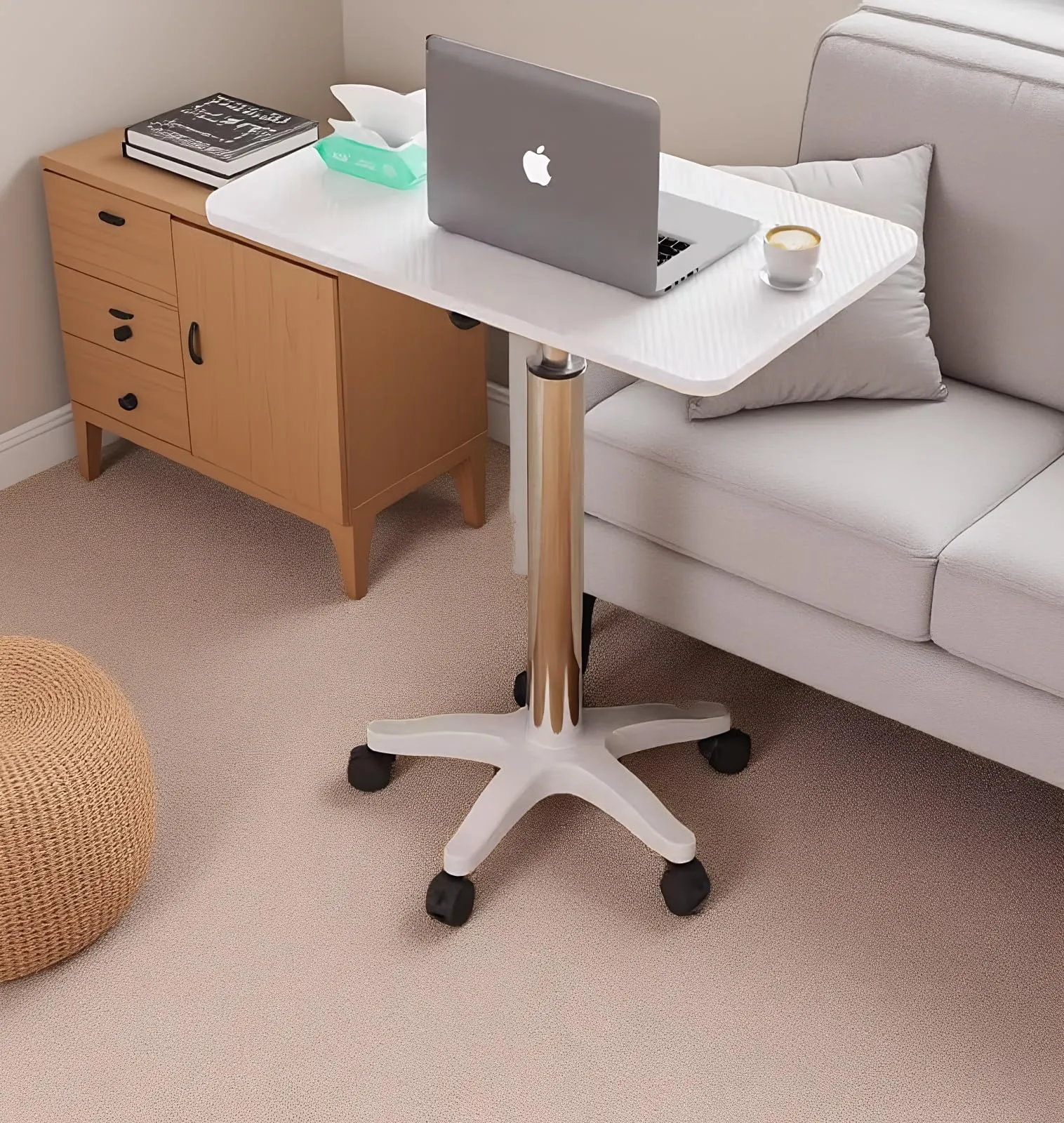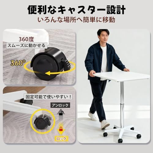 【キャスター付きで移動便利】昇降式テーブルには5つのキャスターを備え、360回転可能で掃除のときもなめらかに動かせますので使い勝手が良い!また、キャスターには固定用の装置がつき、ひと押しでロックできる仕様で移働しない時その場で固定して走り回らずに利用できます。それに、静音設計を採用し、移動時に滑らかで騒音がありません。