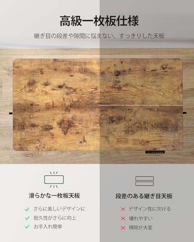 【継ぎ目のない一枚天板で、見た目もお手入れもすっきり】FEZIBO昇降デスクは高品質な一枚天板を採用しているため、隙間や段差が一切なく、見た目の美しさと清潔さを保てます。お手入れが簡単なのはもちろん、一体成型ならではの高い安定性で、快適な作業環境を提供します。