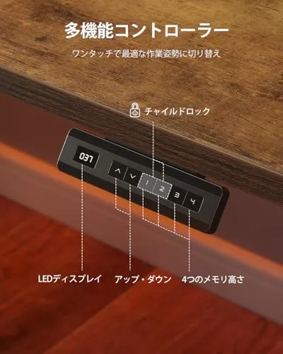 【4つのメモリー機能&チャイルドロック付き手元コントローラー】スタンディングデスクの操作パネルには4つの高さメモリーを登録可能。仕事用・ゲーム用・お子様用など、用途に応じて理想の高さをワンタッチで切り替えられます。さらに、誤操作を防ぐチャイルドロック機能付きで、小さなお子様がいるご家庭でも安心してお使いいただけます。