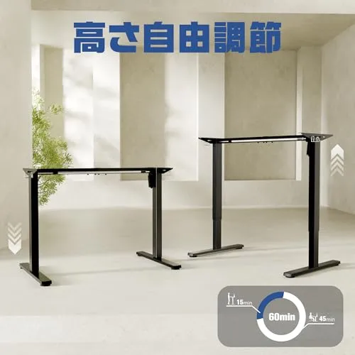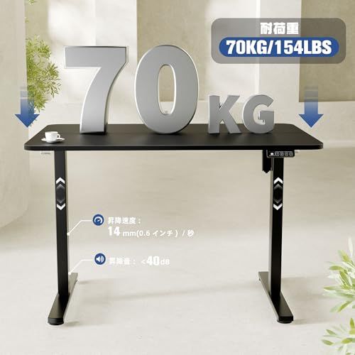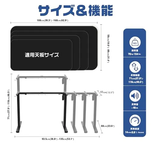 【商品仕様】製品名:昇降デスク フレーム 昇降範囲:71-118CM 昇降スピード:14mm/秒 耐荷重:70kg 本体サイズ:幅95-135CM調節可能*奥行38CM*高さ71-118CM調節可能 本体重量:15KG 本体材質:鋼鉄合金 適用天板サイズ:幅100160cm、奥行5080CM。