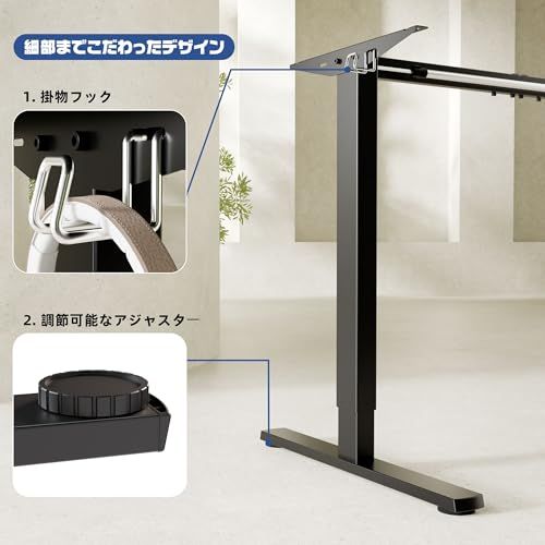 【脚のみ】昇降デスク 脚のみは天板なしで、脚のみでご利用いただけます。 既存の天板を使用することも、お好みの天板を別途購入することもできます。 ベースの幅は95cmから135cmまで調整可能で、100cmから160cmまでの幅広い天板サイズに対応します。両側にフックが付いているので、バッグやヘッドホンを掛けて簡単に収納できます。