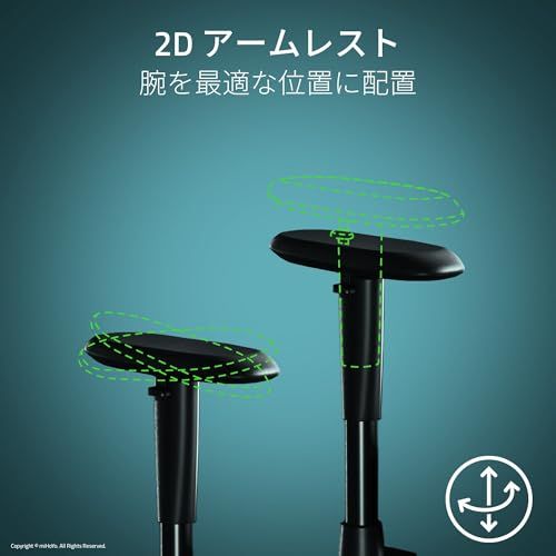 【2D アームレスト - 腕を自然で適した位置に配置】 アームレストは、高さを調節したり、内側・外側に角度を変えたりできるため、ゲーム中も常に自然でリラックスした位置に腕をおくことができます。