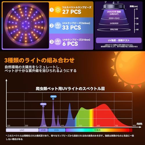 【3つのモード-UVA/UVB/フルスペクトル】従来の爬虫類用紫外線ライトと比較して、当社のUVライトはUVA(365nm)33個、UVB(UVA:310nm UVB:395nm)6個、そしてフルスペクトル27個の電球を搭載しています。このUVライトは、モード1(フルスペクトルのみ)、モード2(UVA UVB同時)、モード3(UVA UVB フルスペクトル同時)の3つの動作モードを備えています。UVA/UVBは爬虫類のカルシウム吸収を促進し、フルスペクトルは自然光をシミュレートします。また、UV光の効果を視覚的に確認し、爬虫類に効果的な光を確実に照射できるよう、UVA/UVBテストカードも提供しています。