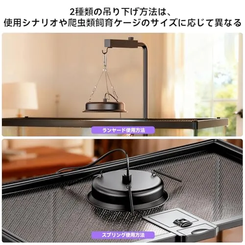 【吊り下げロープ&スプリング二重設計】 UVランプは2種類の吊り下げ方法で簡単設置。ロープは上部固定、スプリングはメッシュ上下に装着可能。工具不要で位置調整も自由です。どんな飼育環境でも爬虫類に均一な紫外線を照射できます。