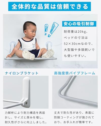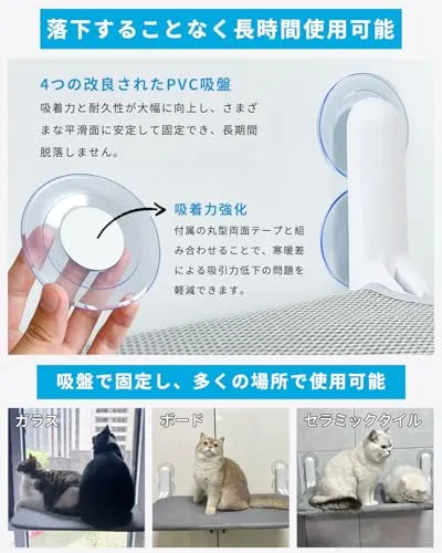 【安心の吸引制御】信頼できる全体的な品質、優れた耐久性と安定性。ベッドのサイズは52*30cm、耐荷重は20kgです。大型の猫や複数の猫でも簡単に使用できます。また、吸盤専用の強力な両面テープ9個が付属しており、さらに安定感・安心感がアップしました。猫ちゃんにとことん寄り添ったハンモックを実現いたしました
