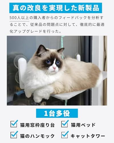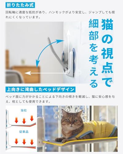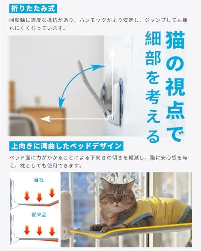 【猫の視点で細部を考える】?折りたたみ軸の抵抗を調整できる設計により、ベッドが突然開いて猫にぶつかり、驚かせるのを防ぎます。使用しないときは折りたたんで収納できるため、カーテンやブラインドの使用を妨げることはありません。キャットタワーやキャットウォークよりも場所を取らず、室内スペースを効率的に活用できます、?上向きにカーブしたベッド形状は、下方向への傾きを抑え、愛猫の安心感を高めます。また、枕としてもご使用いただけます。