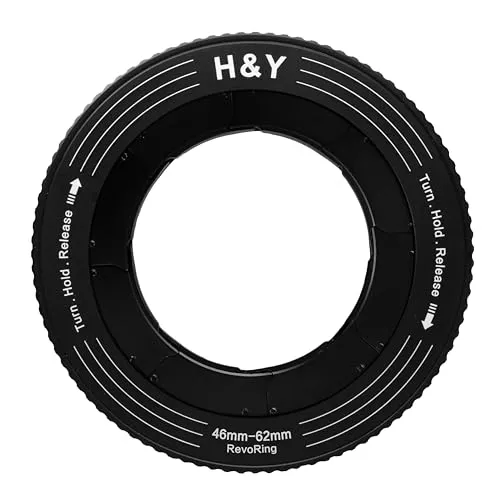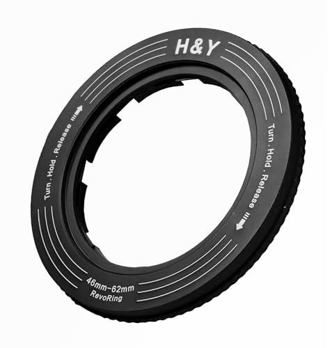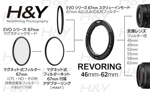 【可変式アダプターリング】フィルター径 46-62mm (67mmフィルター用) H&Y レボリングは1つのフィルターを様々なレンズに取り付け可能になる革新的な可変ステップアップリングです。フィルター径67mmのレンズフィルターを 46mm 49mm 52mm 55mm 58mm 62mm のレンズに装着できます。