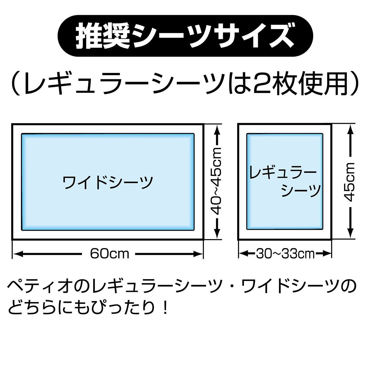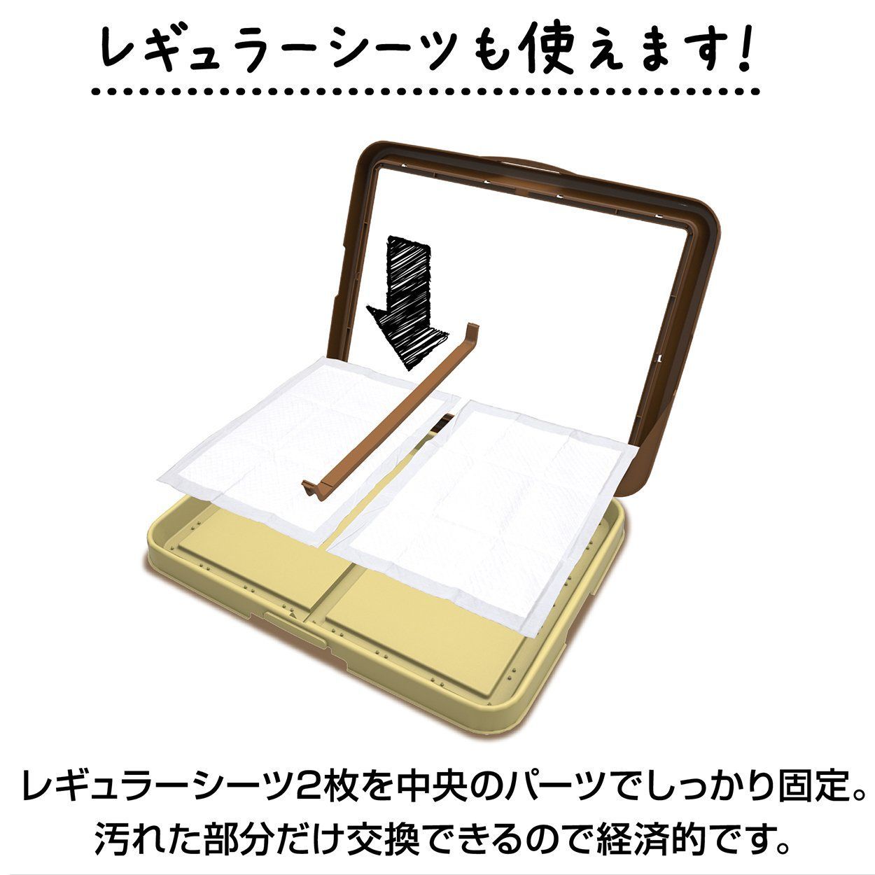 ●幼児・子供・ペットのふれない所に保管してください。 原材料・成分 フレーム:ポリプロピレン、底トレー:ポリプロピレン 使用方法 <レギュラーシーツ2枚使用の場合>1ロックを外し、フレームを上に引き上げてください。ロックはつまみを手前に引くと外れます。※勢いよく持ち上げるとトレーが転倒する恐れがありますので注意してください。2シーツ止めパーツを底トレーから外し、シーツの吸水面がフレーム内に収まるようにセットしてください。※シーツ止めパーツは両端を指で引っ掛けるように引っ張ると外れます。※ペットシーツは中央で重なるように敷いてください。3シーツ止めパーツの両端を軽く押して、シーツを固定してください。4フレームと底トレーをしっかりロックしてください。※力を入れてフレームを押すと破損の原因となりますので注意してください。<ワイドシーツ使用の場合>1ロックを外し、フレームを上に引き上げてください。ロックはつまみを手前に引くと外れます。※勢いよく持ち上げるとトレーが転倒する恐れがありますので注意してください。2シーツの吸水面がフレーム内に収まるようにセットしてください。※シワにならないように注意してください。3フレームと底トレーをしっかりロックしてください。※力を入れてフレームを押すと破損の原因となりますので注意してください。<トイレのしつけ方>1愛犬が大小便をする場所を決め、トレーを置きます。2愛犬がニオイをかぎまわり、ソワソワしはじめたらトレーの上に連れて行きましょう。3大小便をシーツ以外にした時は、直ちに注意しニオイが残らないようにふき取ってください。4トイレ時にはいつも立ち会い、上手にできた時には、よくほめてあげることで習慣づけましょう。<シーツの誤食やイタズラ防止に・・・>愛犬がシーツを誤食したり、イタズラをする場合は、別売のペティオ「シーツ破れ防止カバー」を2枚取付けてください。 ご注意(免責)>必ずお読みください ★愛犬の性格・性質等をご理解のうえ、お選びください。★商品の仕様は予告なく変更する場合があります。★廃棄する場合は、各自治体の指示に従ってください。★品質管理には万全を期しておりますが、お気づきの点がありましたらお客様相談室までお問合せください。 最後までご確認頂き誠にありがとうございました。 上記をご確認頂き、ご購入いただけましたら幸いです。 何かご不明な点がございましたらお気軽にメッセージからお問い合わせ下さい。