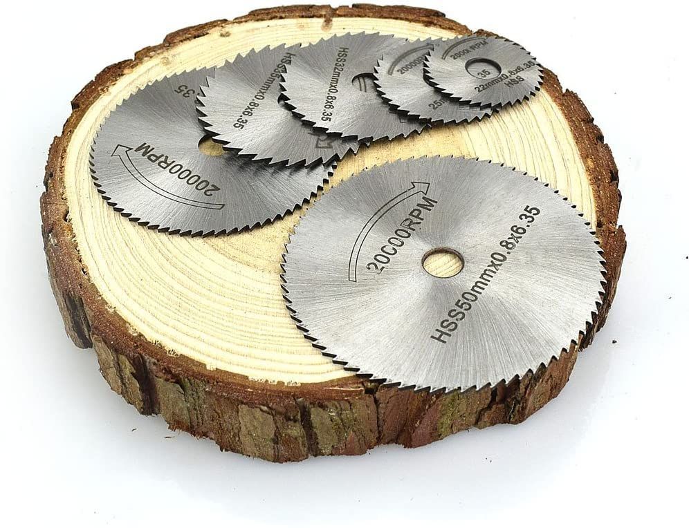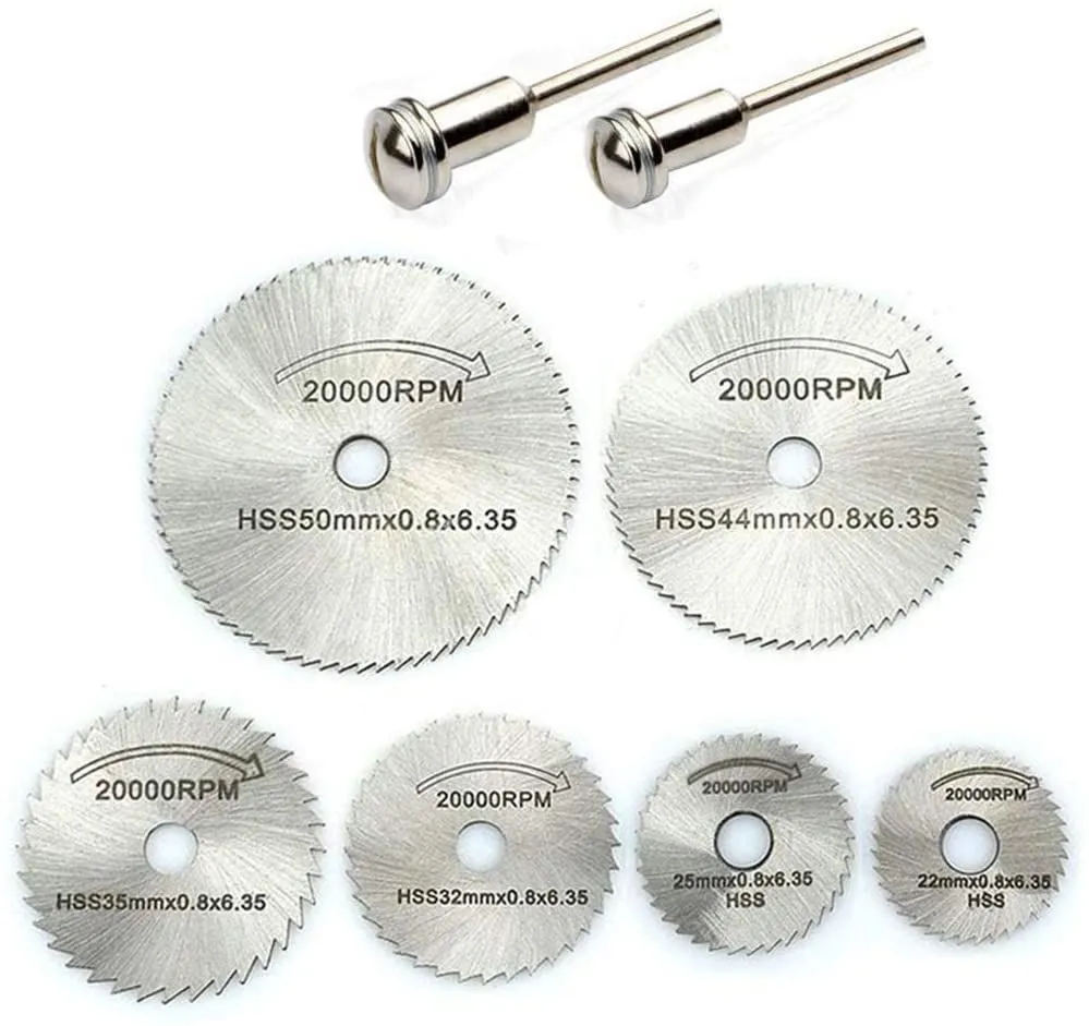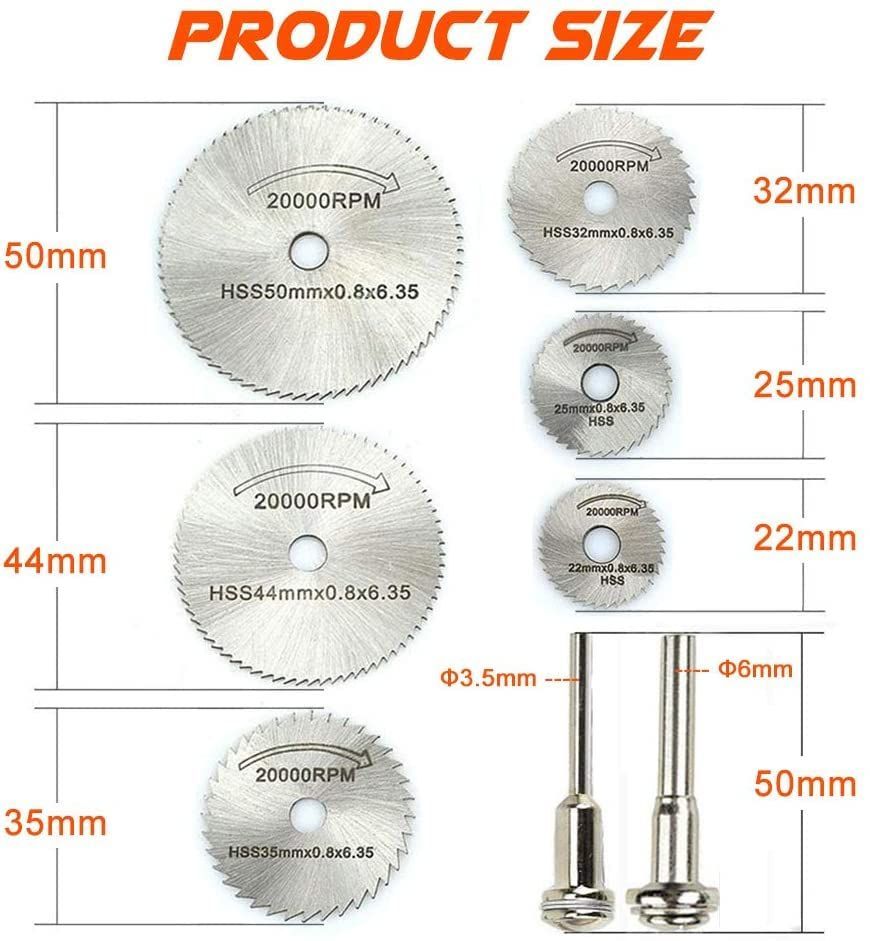 【セット内容】:丸鋸刃*6枚+3.2mmャフト*1本+6mmャフト*1本。丸鋸刃:直径 22mm 25mm 32mm 35mm 44mm 50mm。シャフト:長さ 50mm 先端直径 12mm 延長部分直径 3.2mm、6mm 丸鋸刃厚み:0.8mm。