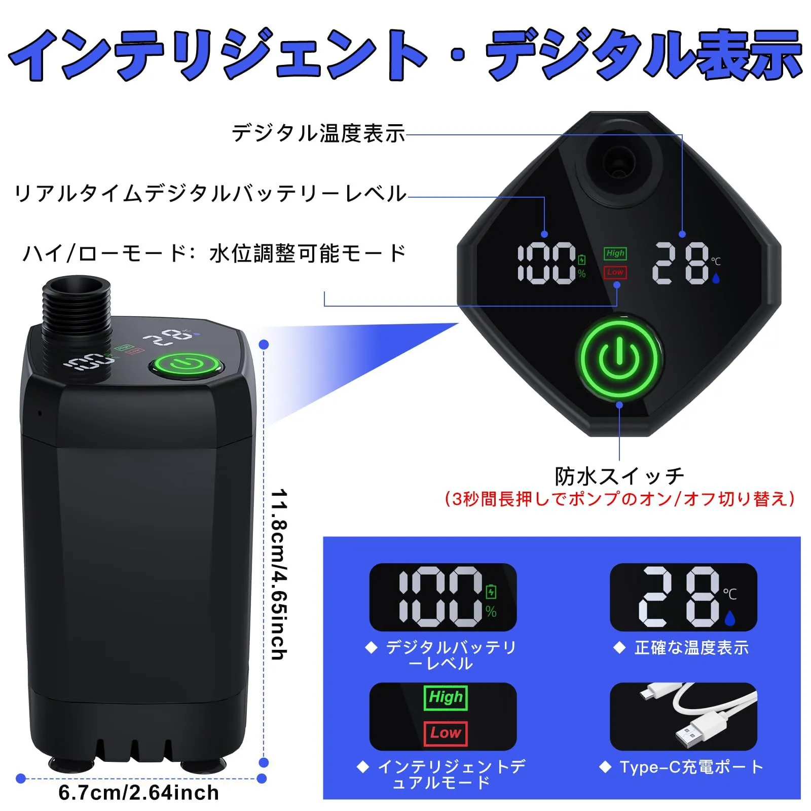 【デジタル表示付き - 注意:加熱機能なし】ポータブルシャワーは060℃の水温に適しています、ポンプは水を加熱する機能はありません。シャワーポンプは水温と電力状態をリアルタイムで表示するデジタルディスプレイを搭載しており、現在の水温と使用電力レベルを把握しやすく、適度な水温でシャワーを楽しむことができ、キャンプ用シャワーポンプの消費電力を把握することができます。