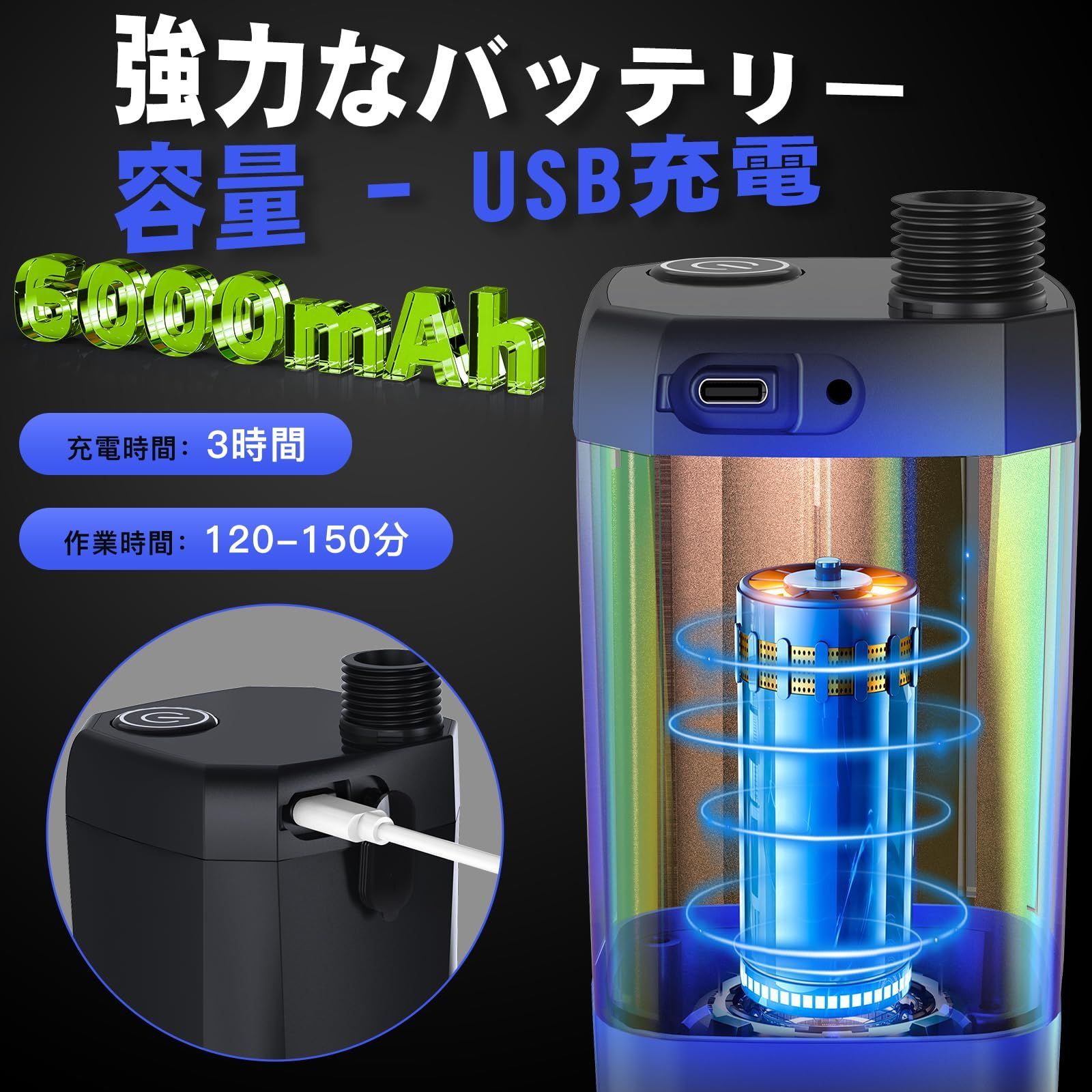 【USB充電式-6000mAhバッテリー容量】ポータブルシャワーは6000mAh大容量バッテリーを内蔵しており、フル充電状態で120-150分間連続使用できます。Type-Cポート付き電動シャワーは携帯電話充電器(5V-2A)、携帯電話電源、ノートパソコンや車のUSB出力で充電でき、いつでもどこでも充電できて便利です。コードレスUSB充電システムの設計により、簡易シャワーは場所を取らず、再利用可能で、環境に優しく、省エネです。(ポンプには水を加熱する機能がありません。)