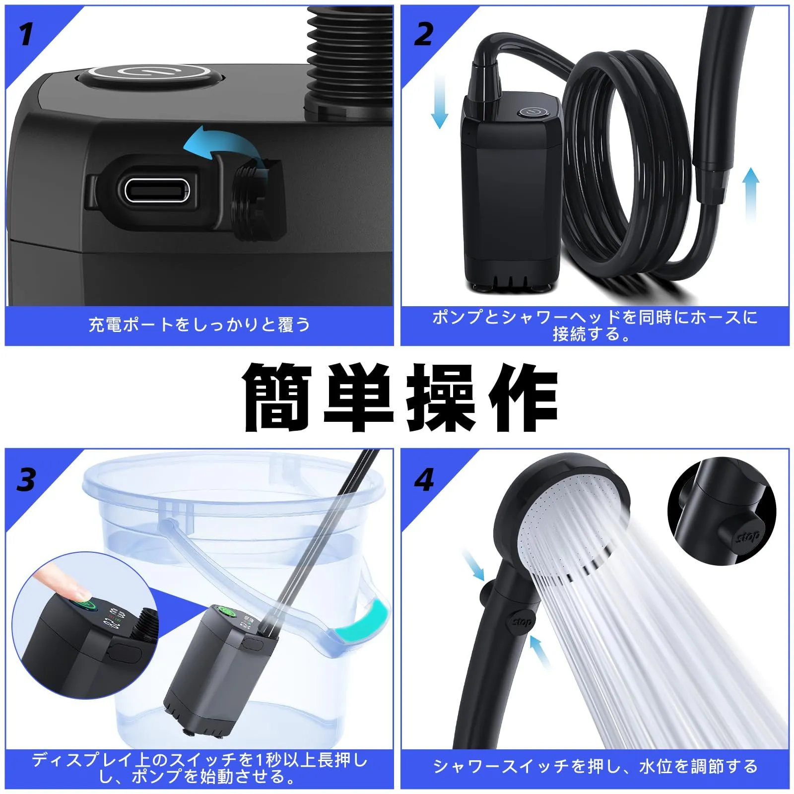 【防水で頑丈: 底の吸盤デザイン】電動シャワーポンプはIPX7防水等級を持ち、完全に水に浸かることができます、充電口には防水カバーが装備されています、ご使用の際は防水カバーが締め付けられ、使用の安全を確保することにご注意ください。簡易シャワーポンプの底に吸盤のデザインは、シャワーポンプが傾かないようにバケツの底にしっかりと取り付けられていることをします。