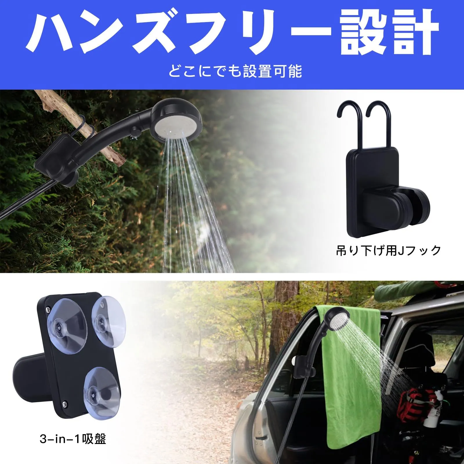 【使いやすい・豊富な付属品】ポータブルシャワーはシャワースタンド、吸盤、フックが付属しており、ハンズフリーシャワーを楽しむことができ、両手が自由になります。ブラケットと吸盤を組み合わせれば、シャワーヘッドを平らで滑らかな面に取り付けることができ、ホルダーとフックを組み合わせれば、シャワーヘッドを木の枝などに吊るすことができます。フックは単独でタオルを掛けることもでき、とても便利です。 最後までご確認頂き誠にありがとうございました。 上記をご確認頂き、ご購入いただけましたら幸いです。 何かご不明な点がございましたらお気軽にメッセージからお問い合わせ下さい。