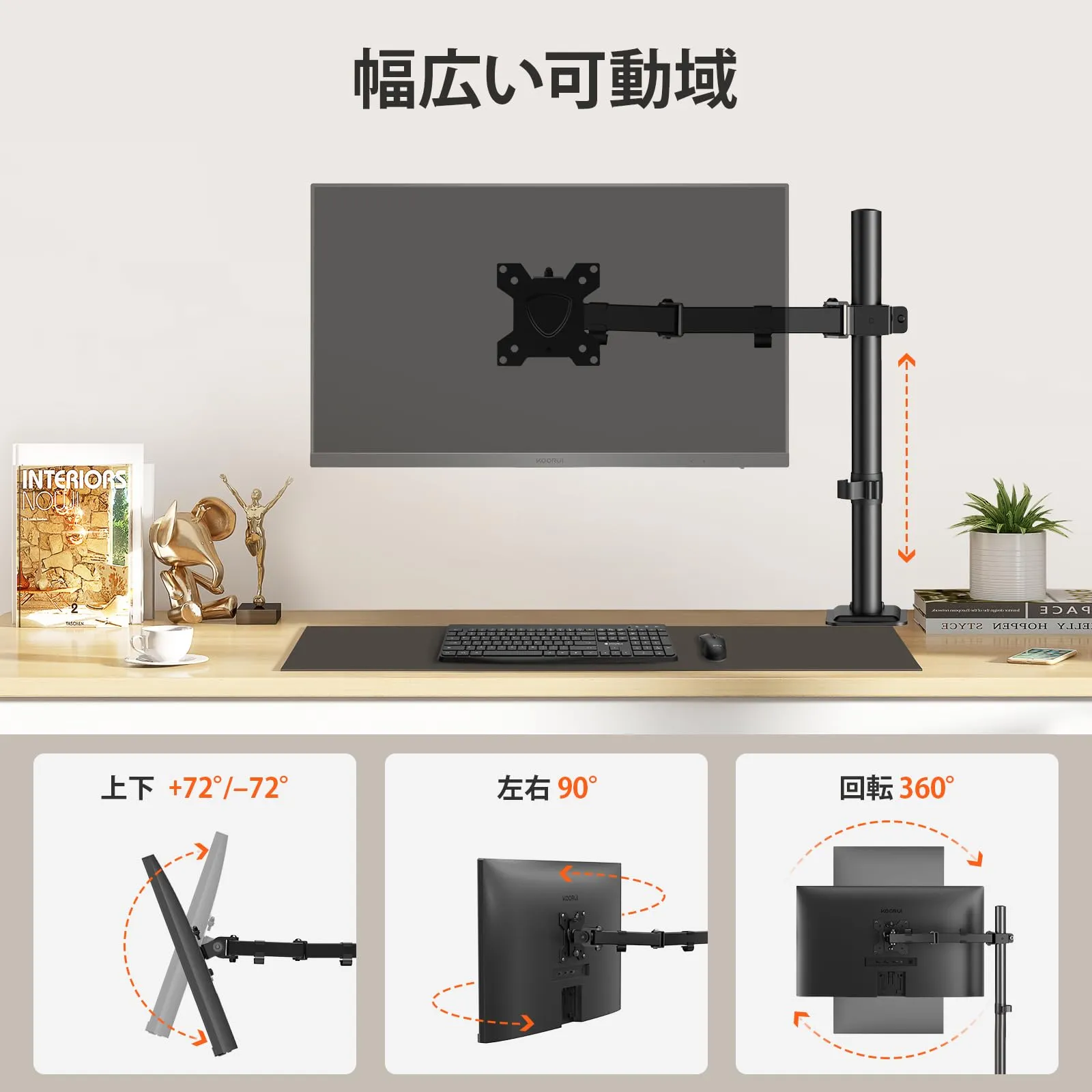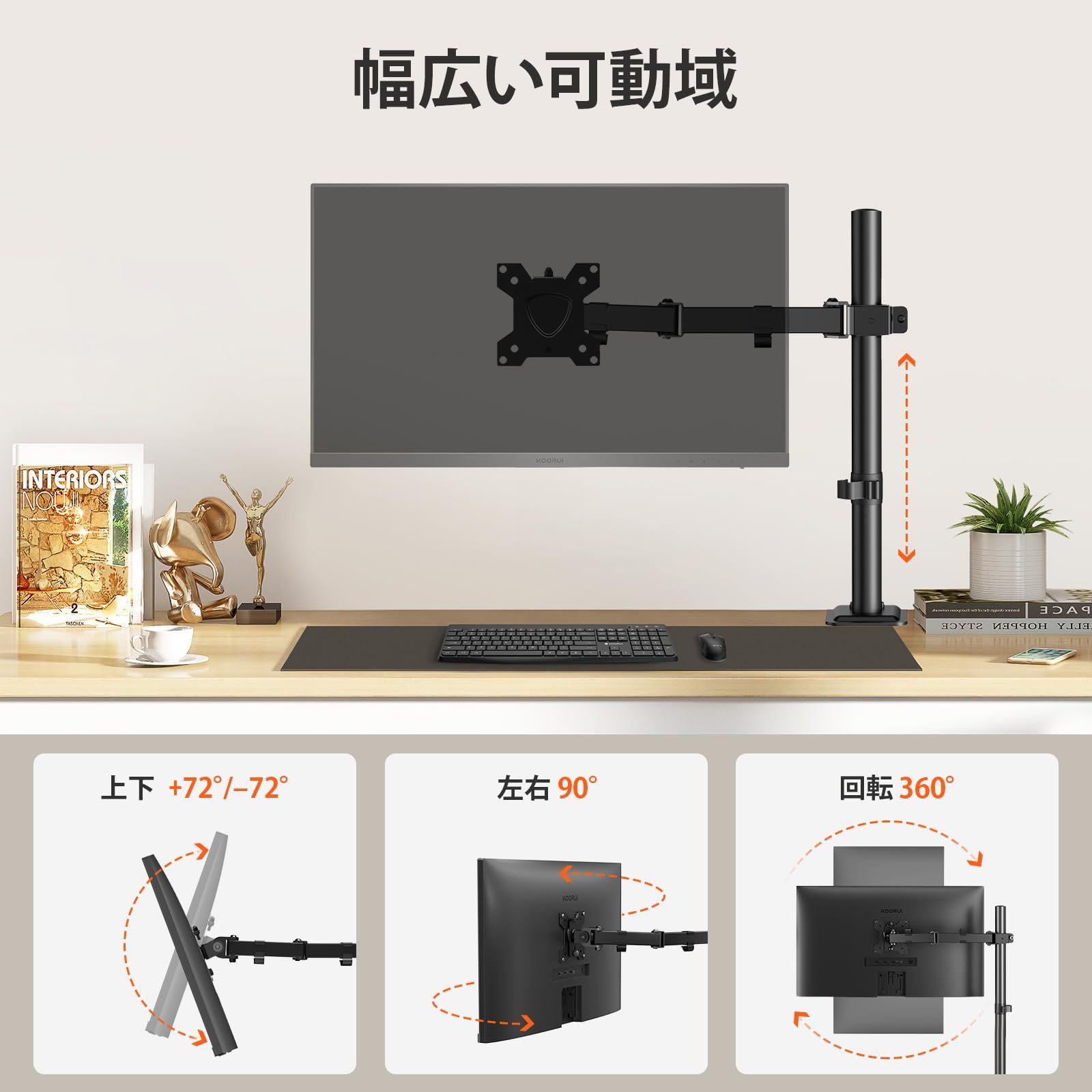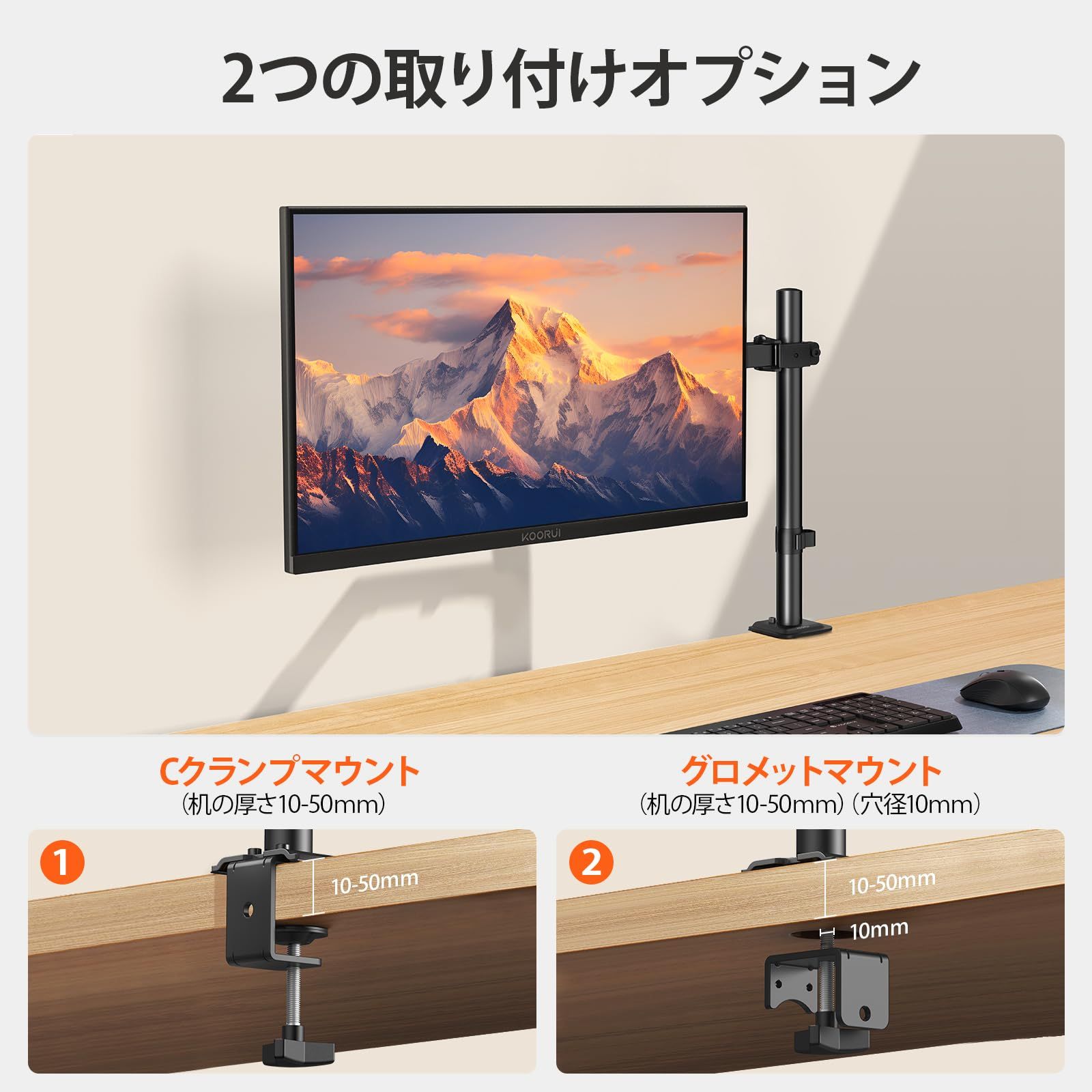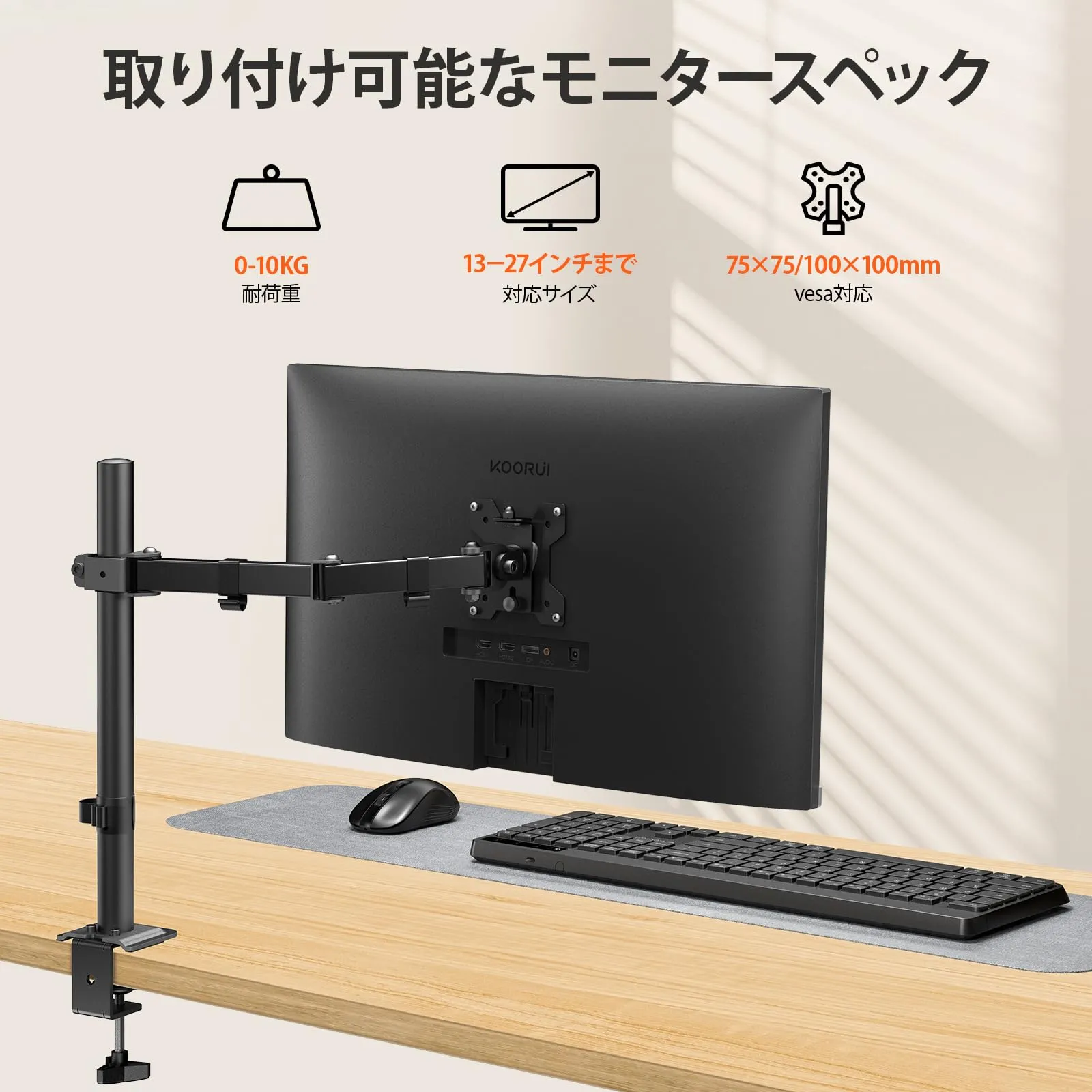 新品 KOORUI シングルモニターアーム 13~27インチ モニターアーム 1画面 耐荷重10kg チルト スイベル 回転 高さ調節可能 ケーブル管理 デスク設置用 VESA規格75*75mm 100*100mm,KR10G