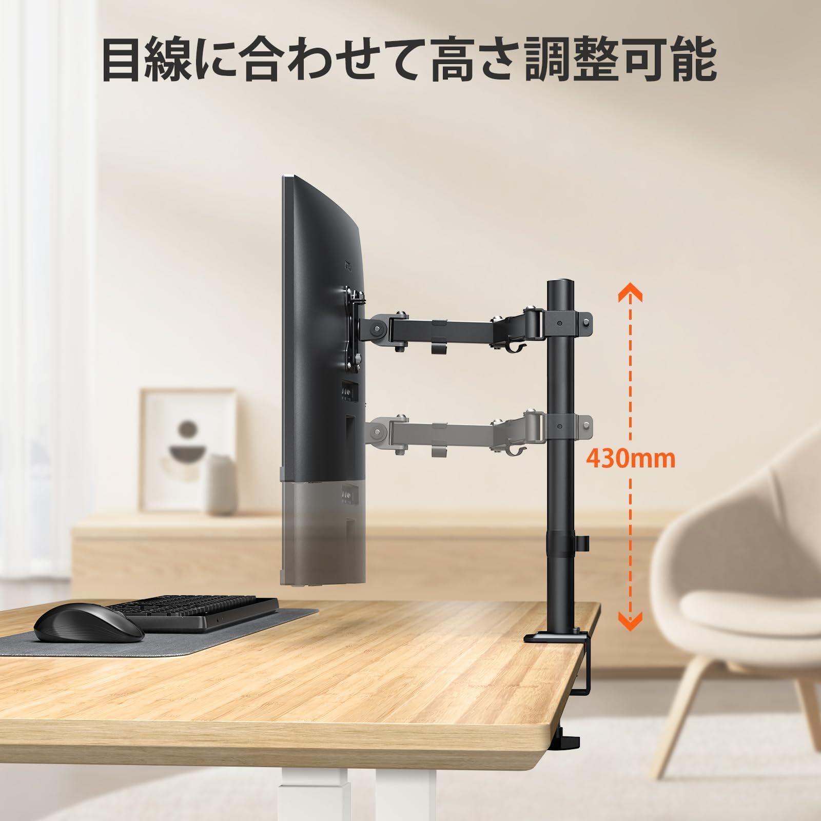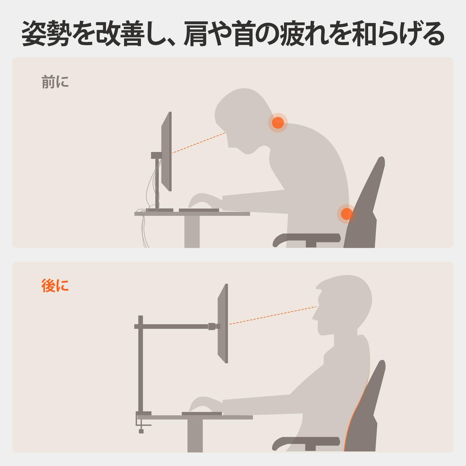 【自由な角度調整】パソコンアームスタンドは前後±72°チルト、左右90°の回転、360°スイベル可能で、アームの最長320mm、高さ430mmまで調整できます。 最適な視野角が得られます。