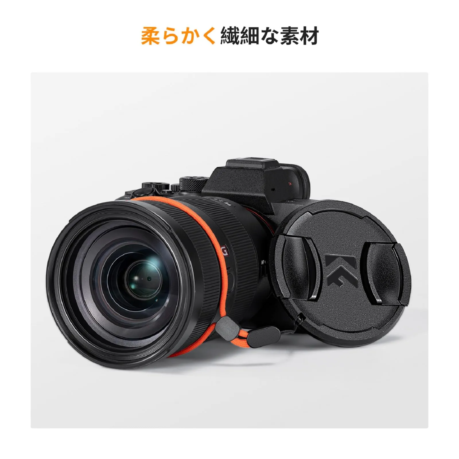 【紛失防止ストラップ】キャップの側面にストラップホールが設けてあり、レンズ本体に直接取り付けることができるため、非常に便利です。また、紐は鮮やかなオレンジ色で紛失にくいです。