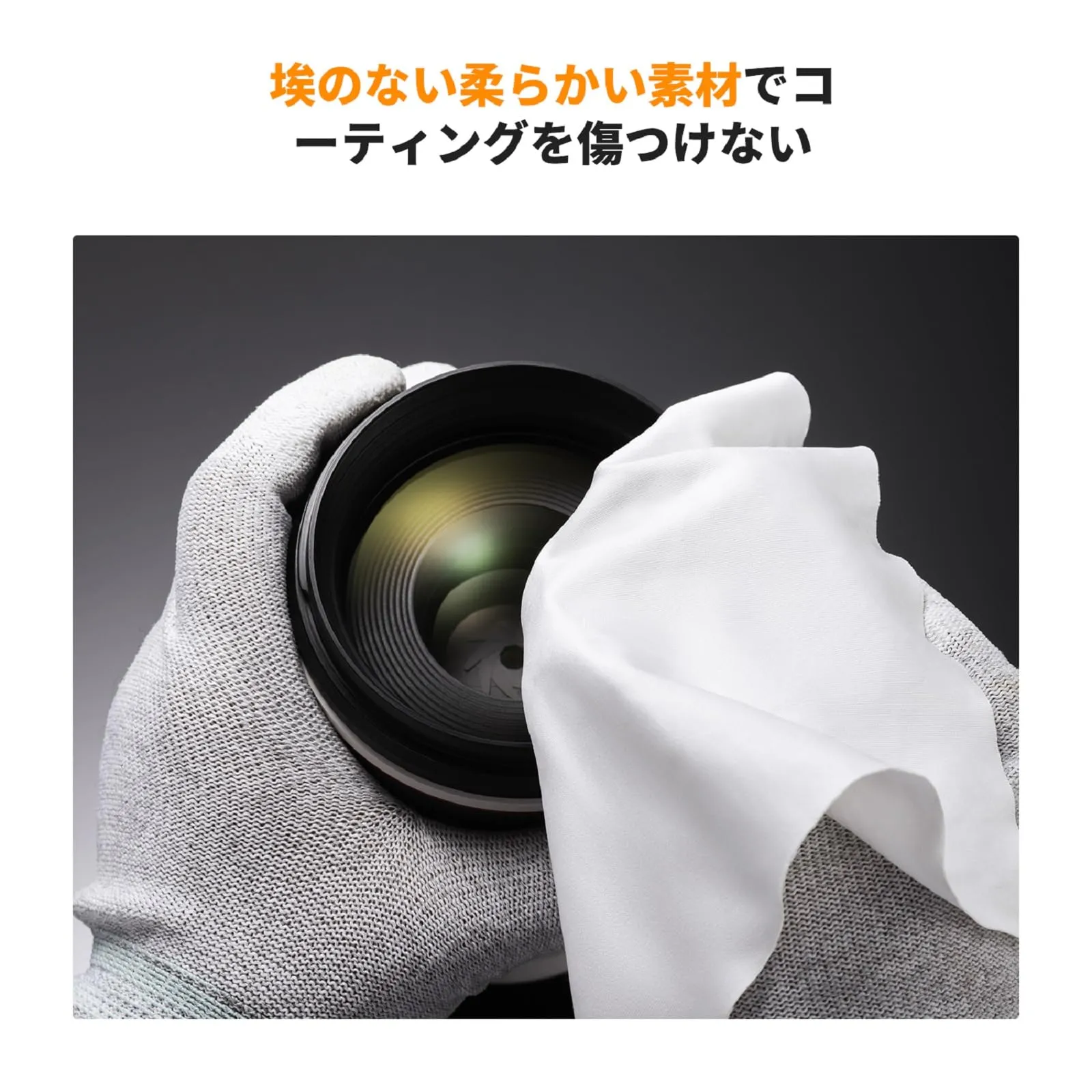 【2枚入り真空包装クロス】付属クリーニングクロスはマイクロファイバーを採用し、優れた吸水性・通気性・清潔力がある。しつこい油膜や皮脂の汚れもスッキリ除去可能。レンズやレンズフィルターなどの光学機器のコーティングに損傷を与えない。個別真空包装を採用し、クロスは使用前に真空無塵の状態で保存され、清潔に保つことができる。