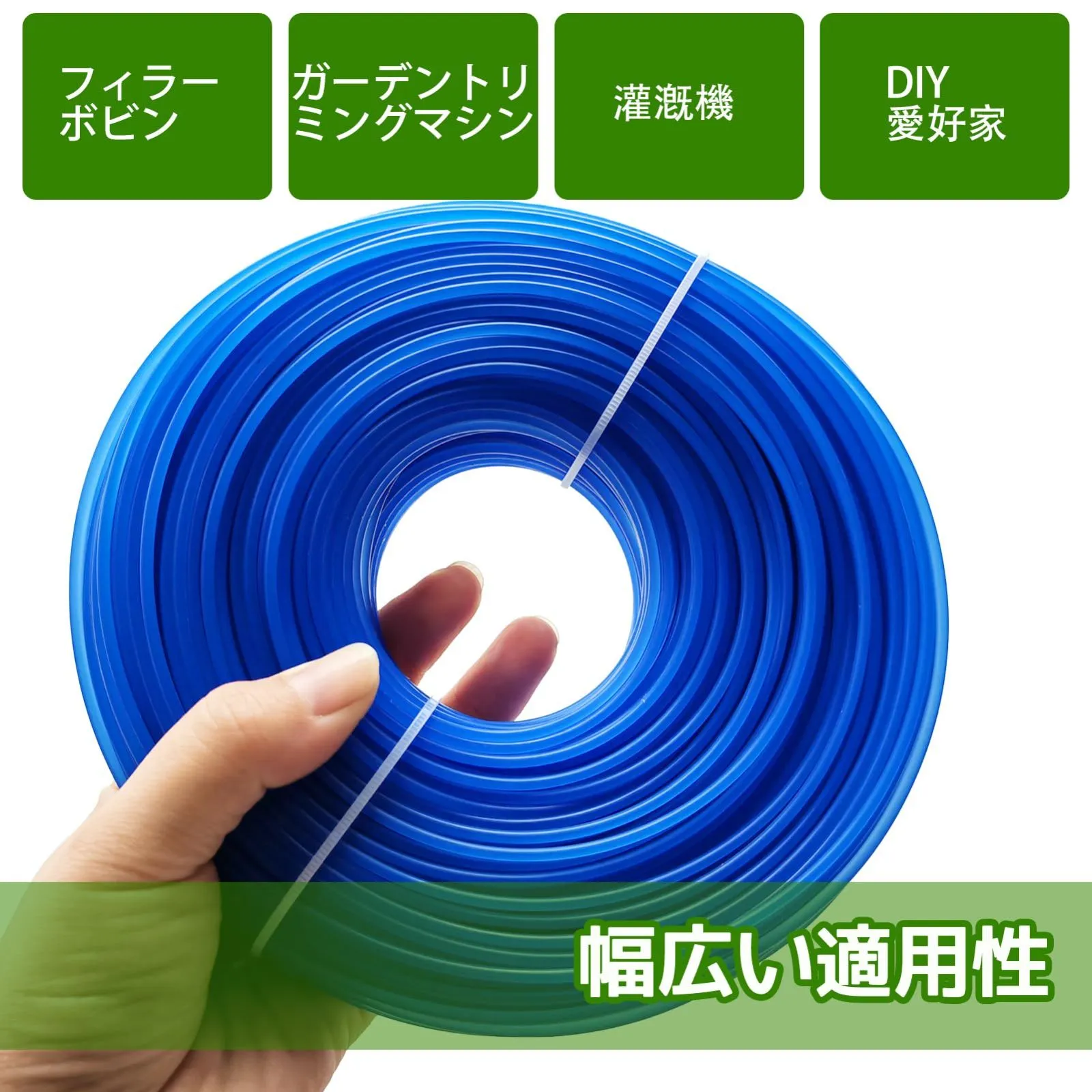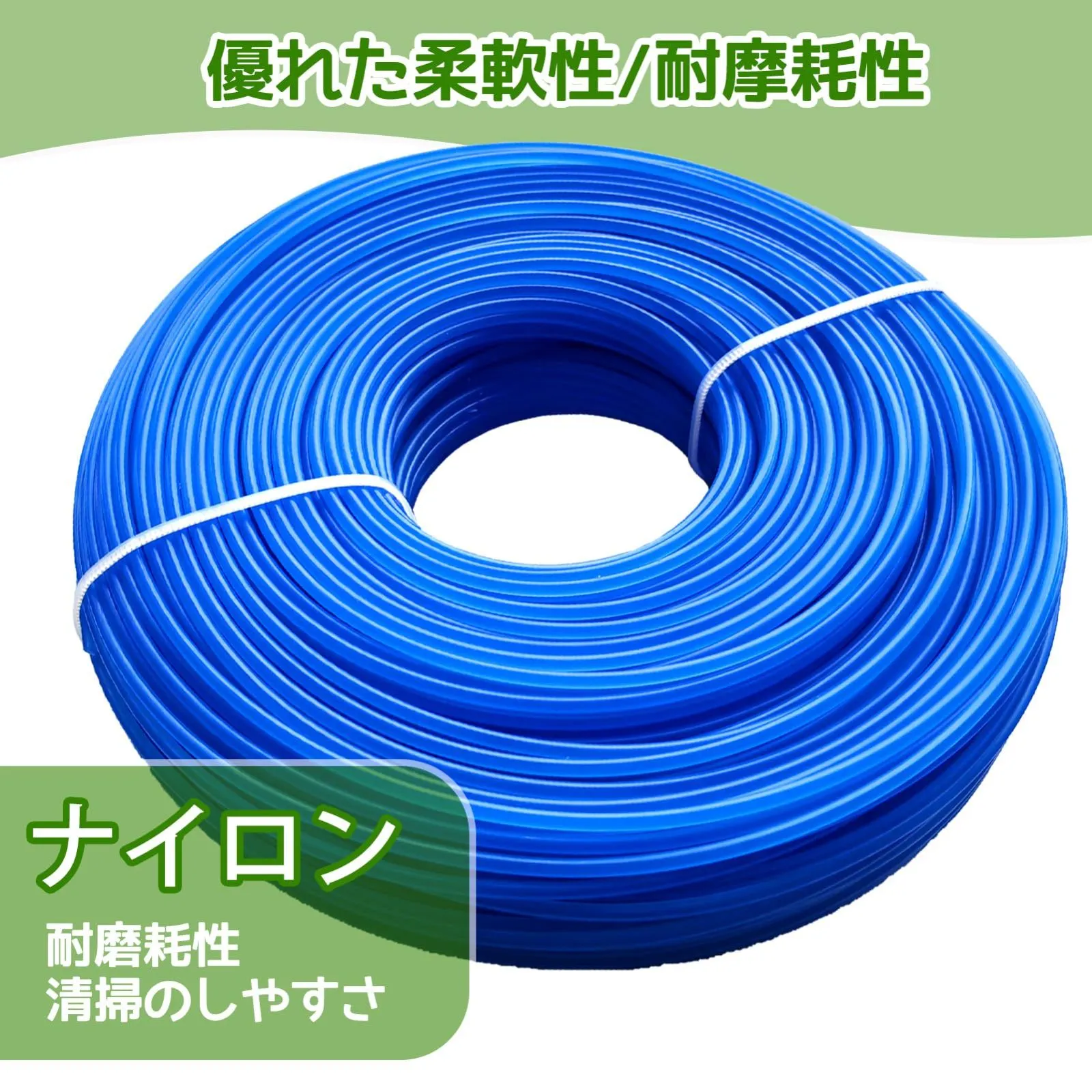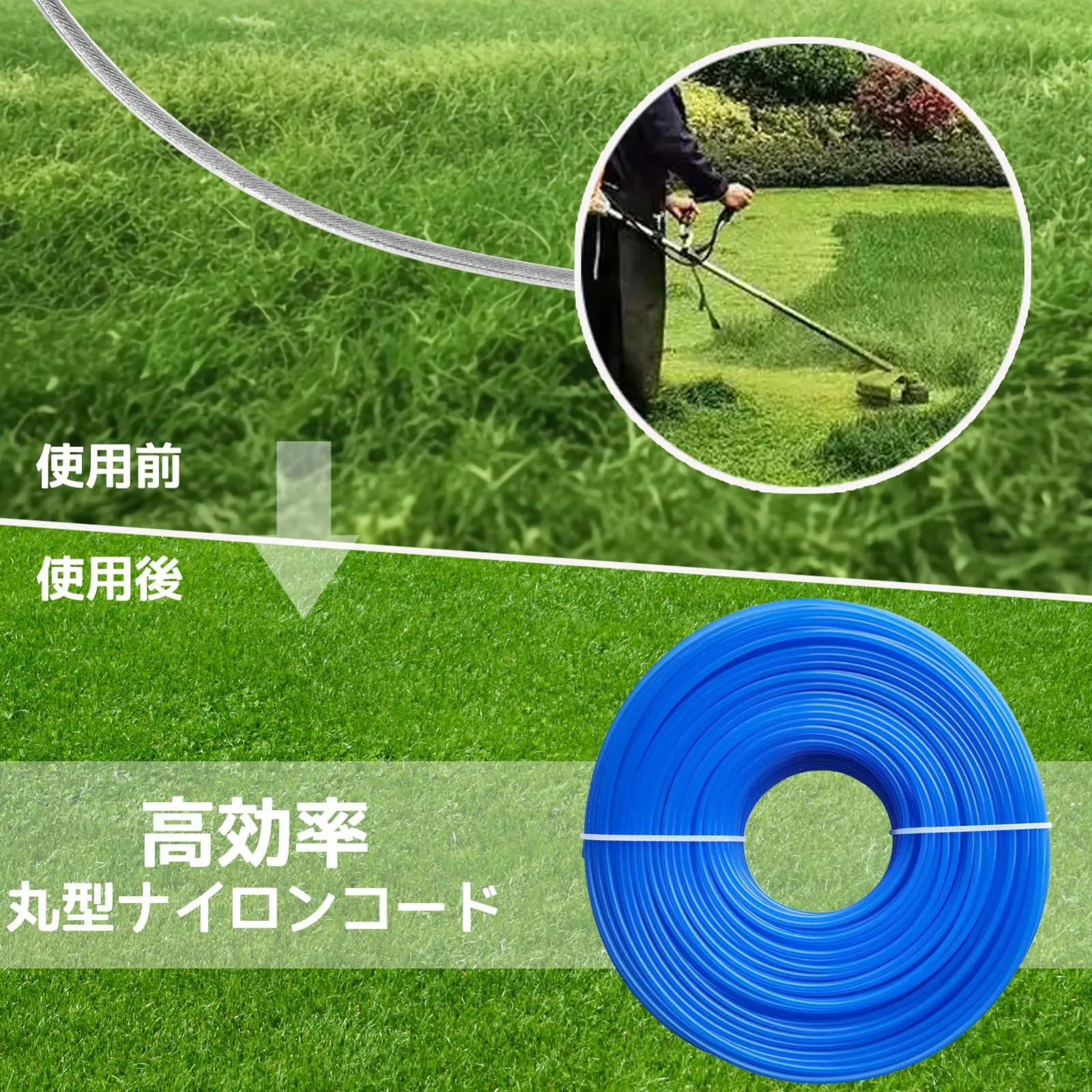 【ご注意】①ご使用の際は、地面や石、小石、缶などの障害物に触れないよう十分注意してください。障害物に当たるとコードが破損したり飛散して思わぬ事故になる可能性があり、破損を減らすためにも安全にご使用いただければ幸いです。 ②長期保管でナイロンロープがもろくなるおそれがあるため、使用前に 24 時間水浸しすると、その靭性を維持できます。 商品特徴