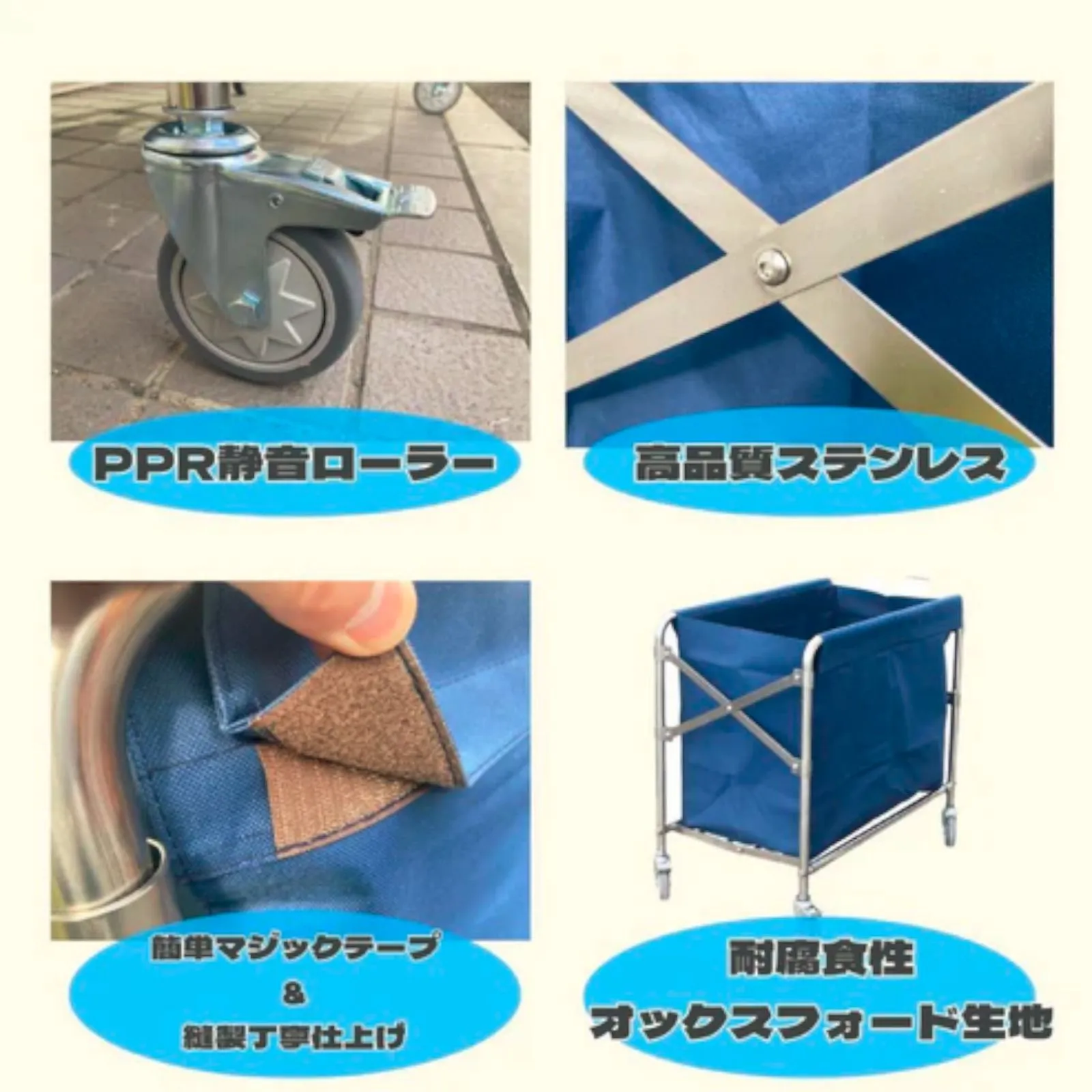 【耐久性素材】 リネンカートは、清掃カートとしても活用できます。耐荷重200kgのステンレススチールフレームを使用できます。バスケット部分は分厚いオックスフォードキャンバス生地を採用しております。 屋内および屋外で使用することが可能です。