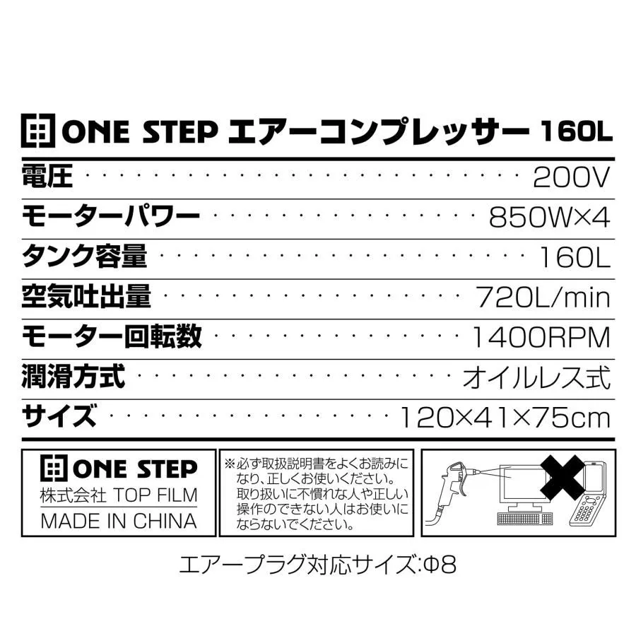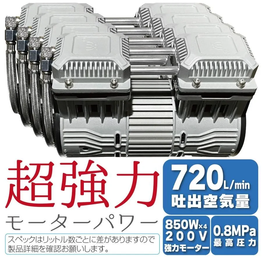 【製品詳細】容量:160L ・電圧:単相200V15A ・モーター回転数:1400RPM ・空気吐出量:720L/min モーターパワー:850W×4 ・最高使用圧力:0.8MPa ・デシベル:約95db 定格時間:満タンまで150秒/動作中も常時30秒毎に自動空気注入 待機時間なしで継続的に使用可能