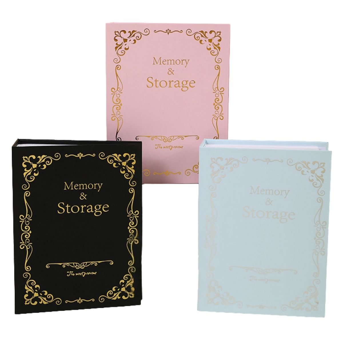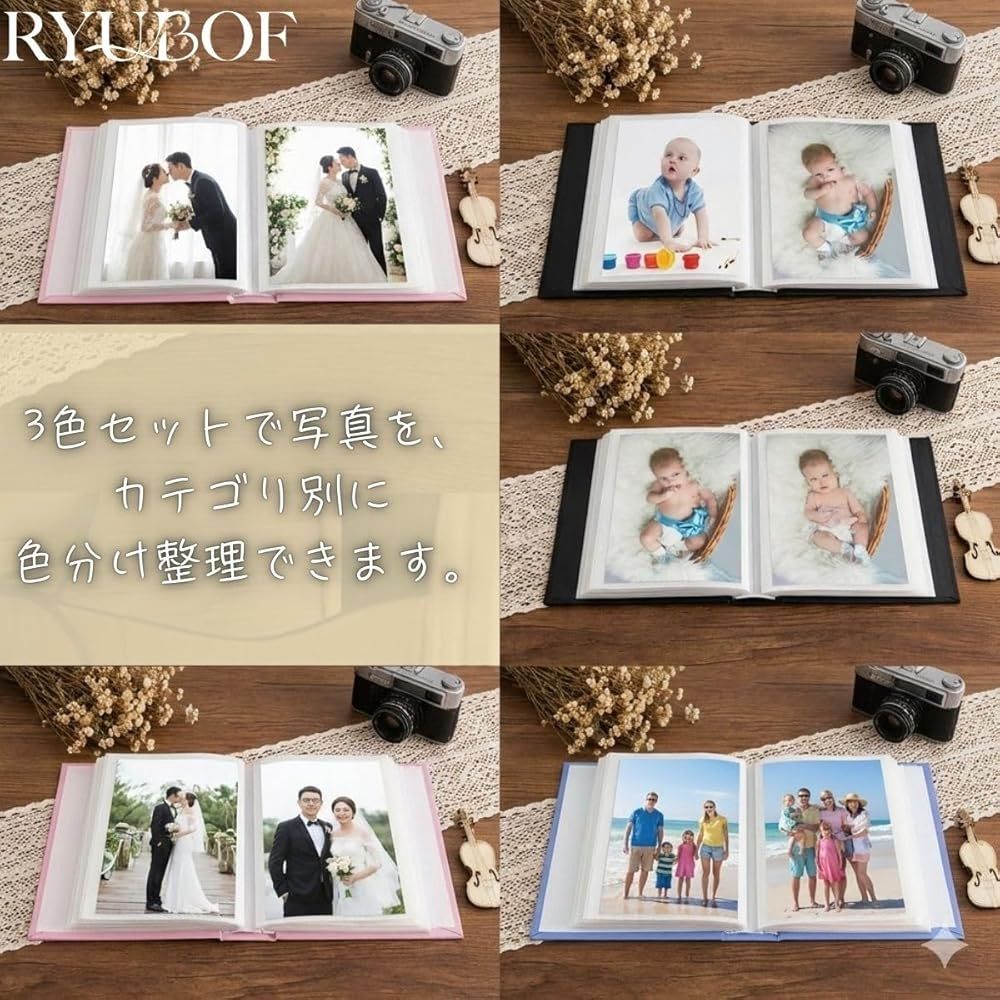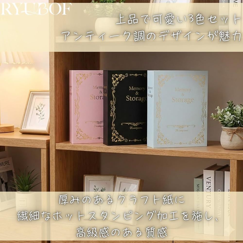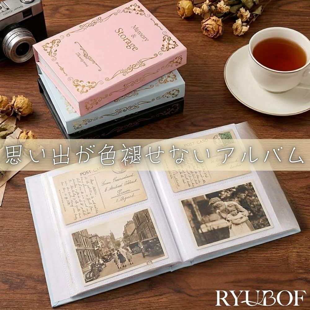 【上品で可愛い3色セット】ピンク・ブルー・ブラックの3冊が揃うフォトアルバムはがきサイズ対応で、アンティーク調のデザインが魅力、写真をおしゃれに残したい方にぴったりです。
