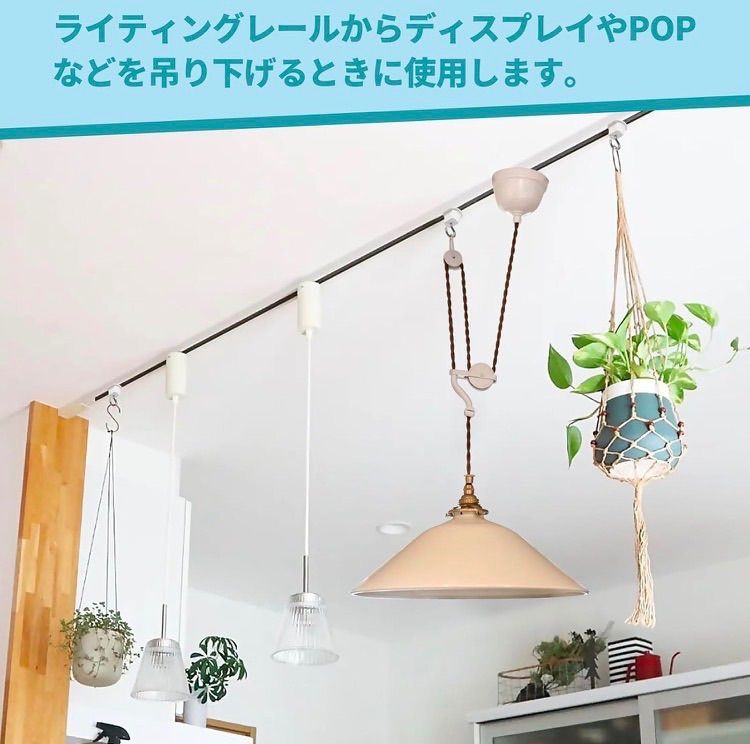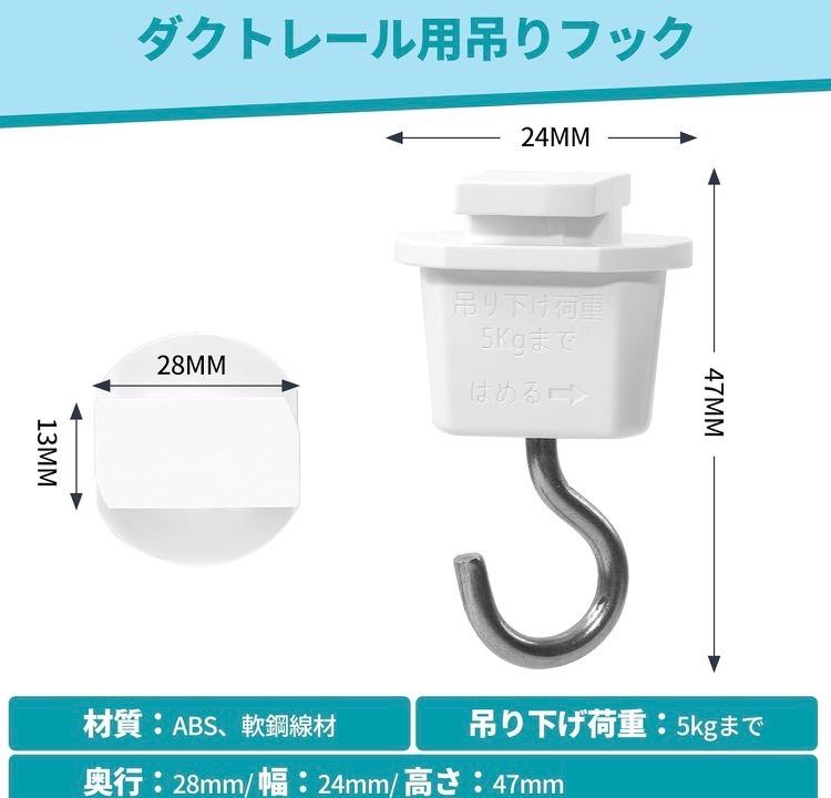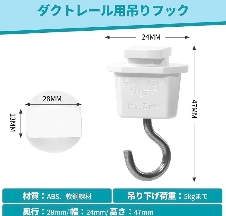 【仕様】ライティングレールからディスプレイやPOPなどを吊り下げるときに使用します。 色:ホワイト 重量:12g 材質: ABS、軟鋼線材 吊り下げ荷重:5kgまで 奥行:27mm/幅:24mm/高さ:46mm 保証期間:1年保証 2、